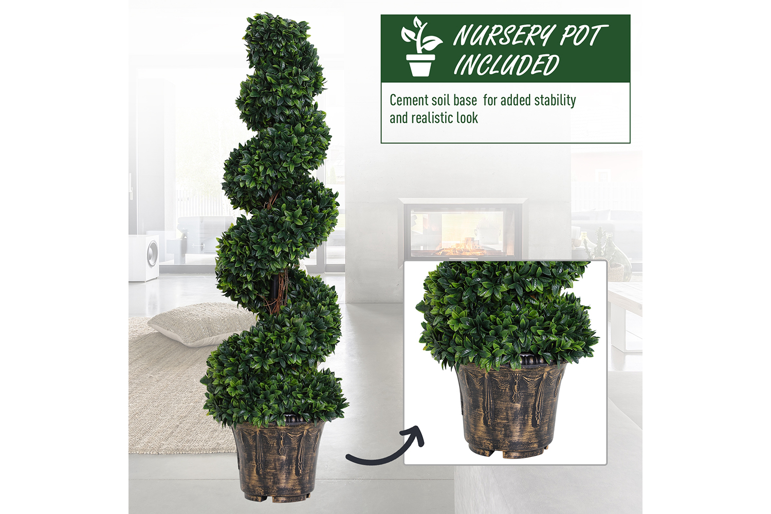 This beautiful fake decorative Buxus spiral design topiary plant set from Outsunny will make you feel like in the park or fields, add a natural touch in your home with this artificial tree. Realistic looking branches can be bent according to your preference and low maintenace is needed. Comes pre-potted,it is delivered ready to use and goes well with any kind of décor, great for indoor and outdoor spaces.