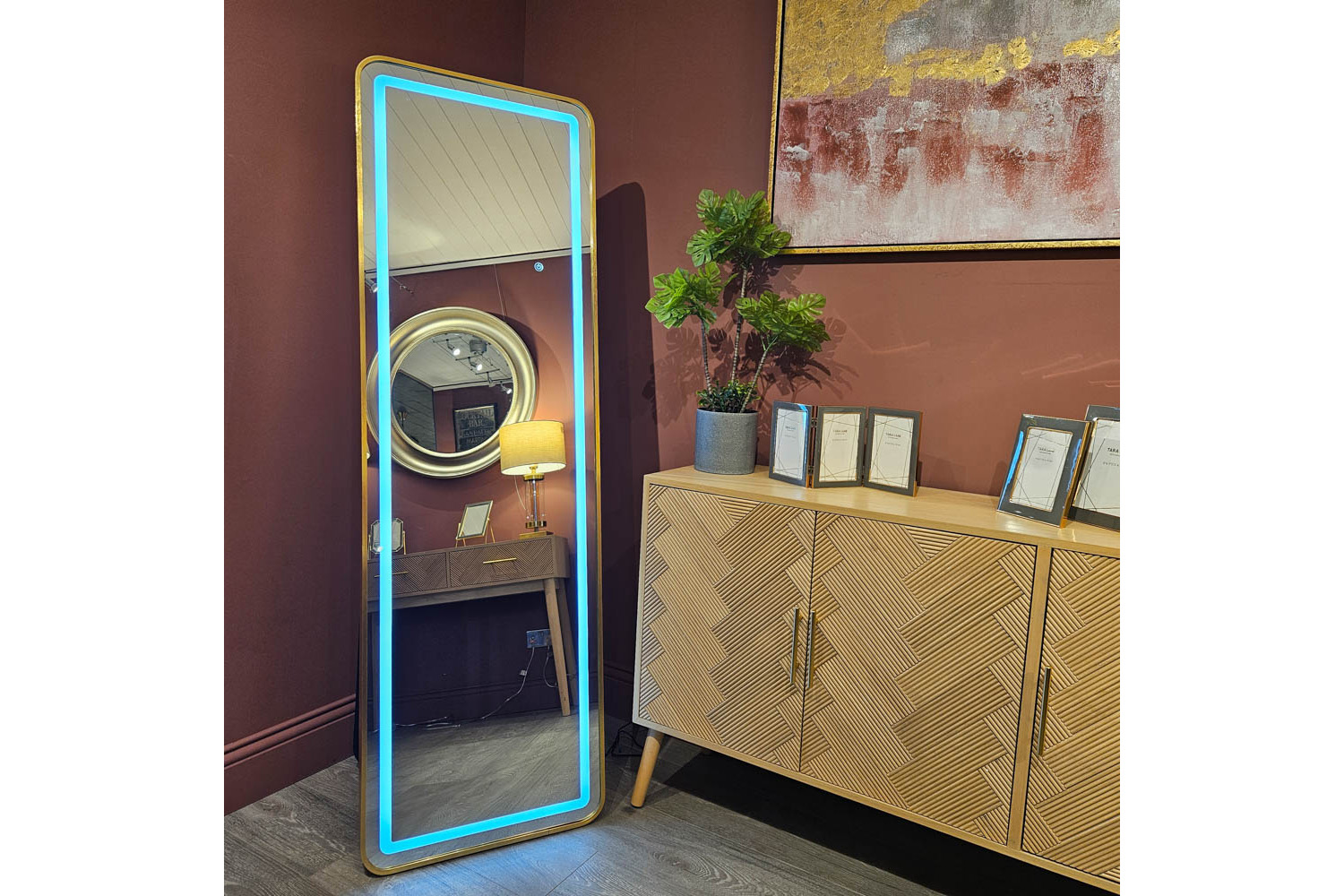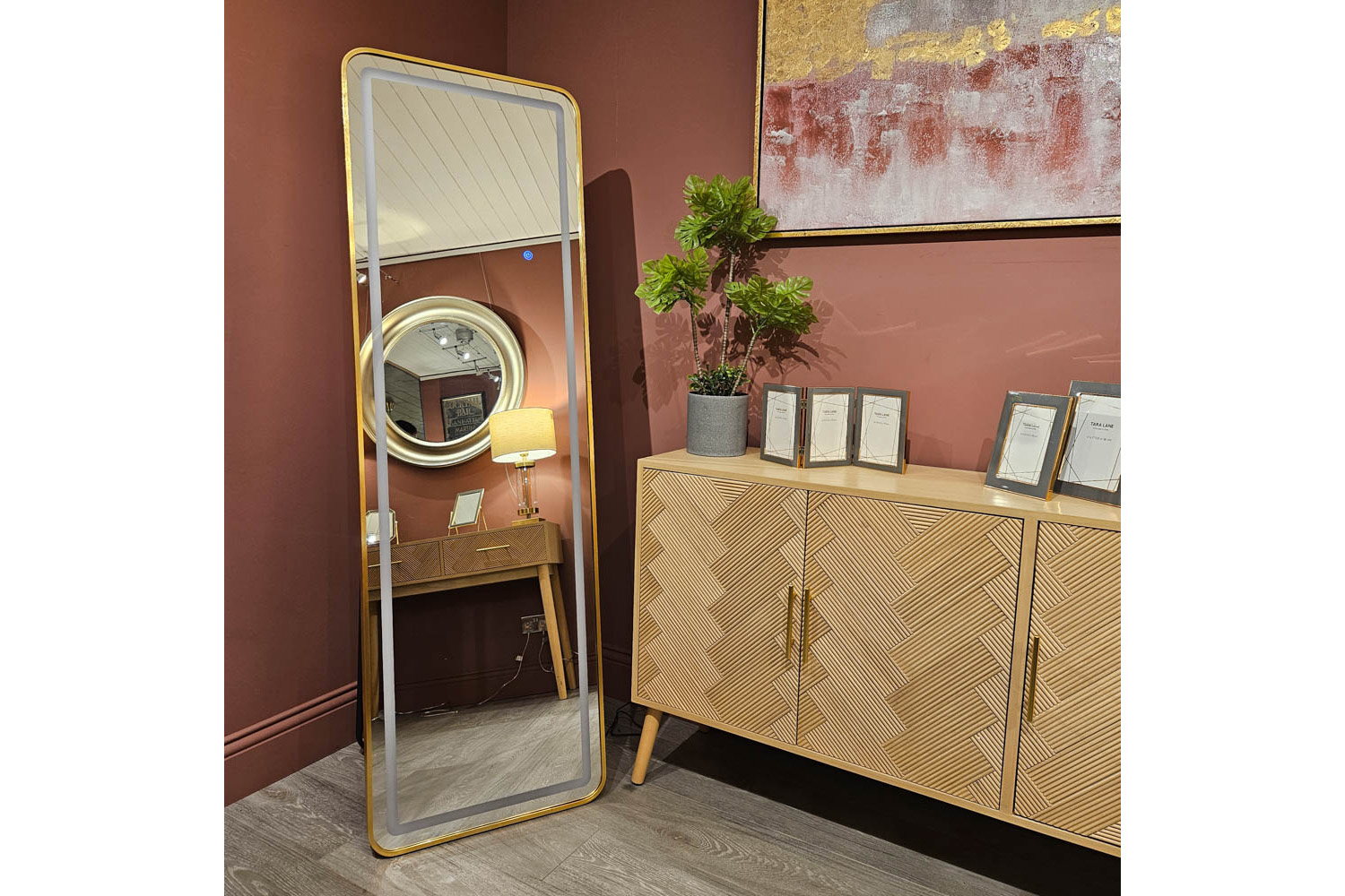 The perfect item to add style and depth to any room is the Modena LED Cheval mirror a stunning blend of functionality and modernity. With integrated LED lighting, this mirror offers optimal illumination for dressing, ensuring you always look your best. The gold finish adds a touch of glamour, making it a statement piece in any space.