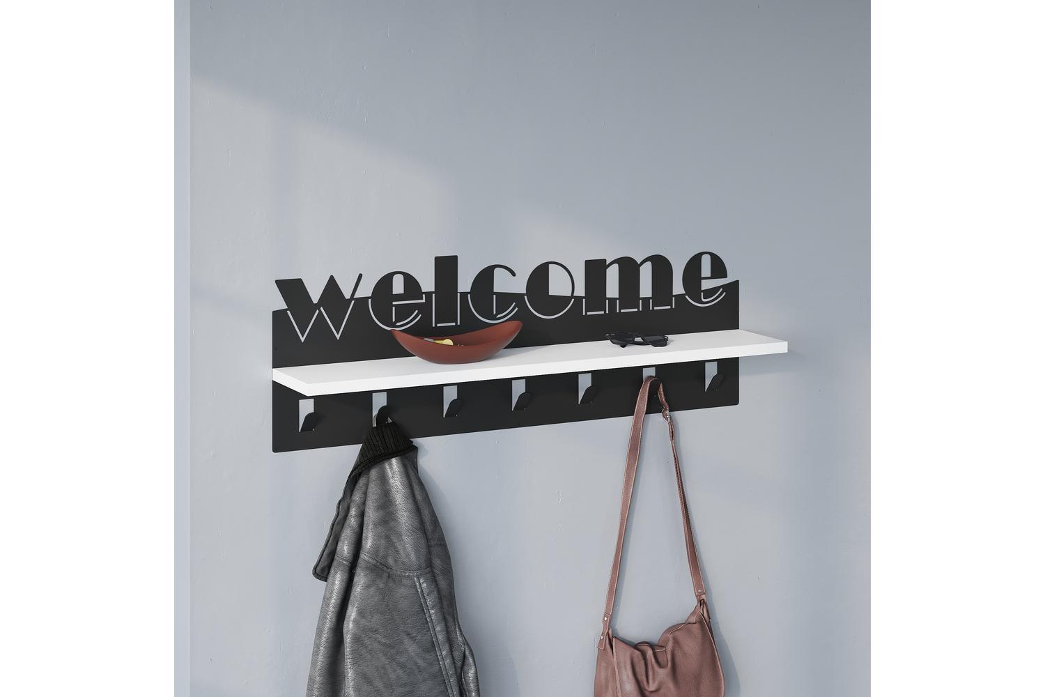 Decortie Modern Welcome Letter Wall Hanger | Wall Shelf Rack | White Metal | 7 Hooks | 86cm