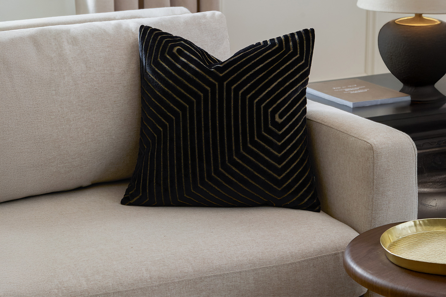 Revamp your furniture with the stunning Evoke cushion. Boasting a minimalist gold geometric design across a black background, this cushion exudes subtle refinement. Boasting a feather filling with a polyester cover, this cushion exudes maximum comfort, offering the perfect place for you to cuddle up to. Combining contemporary design with incredible comfort makes this cushion the perfect accent piece for any space.