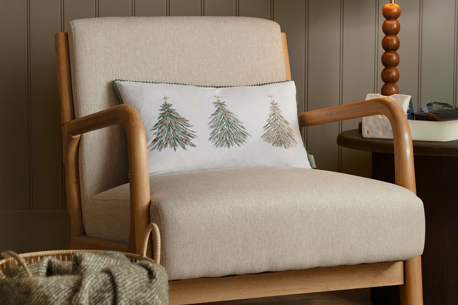 Add a touch of festive magic to your space with our charming Twinkling Tree Trio cushion. Set against a natural-toned background, this cosy accent features three beautifully detailed Christmas trees, capturing the spirit of the season. Crafted with a soft linen cover and finished with a soft green piped trim for a cheerful pop of colour, it blends rustic charm with holiday elegance. Inside, a plush polyester filling ensures comfort and cosiness.