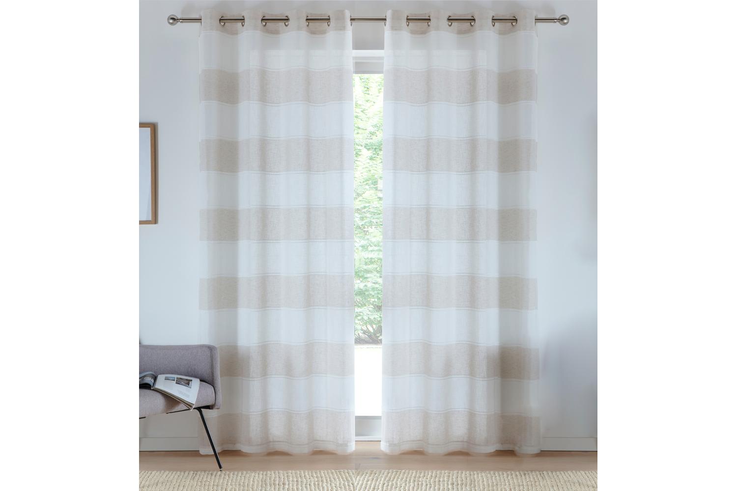 Create the remarkable setting that mimics the aura of an ethereal Santorini escape with our TYRONE TEXTILES - 140x137cm Natural Eyelet Santorini Pair of Modern Linen Look Striped Panels 55x54. Catered for Ireland's discerning homeowners, these panels suffuse your space with well deserved timeless elegance, redefining your home furnishings.