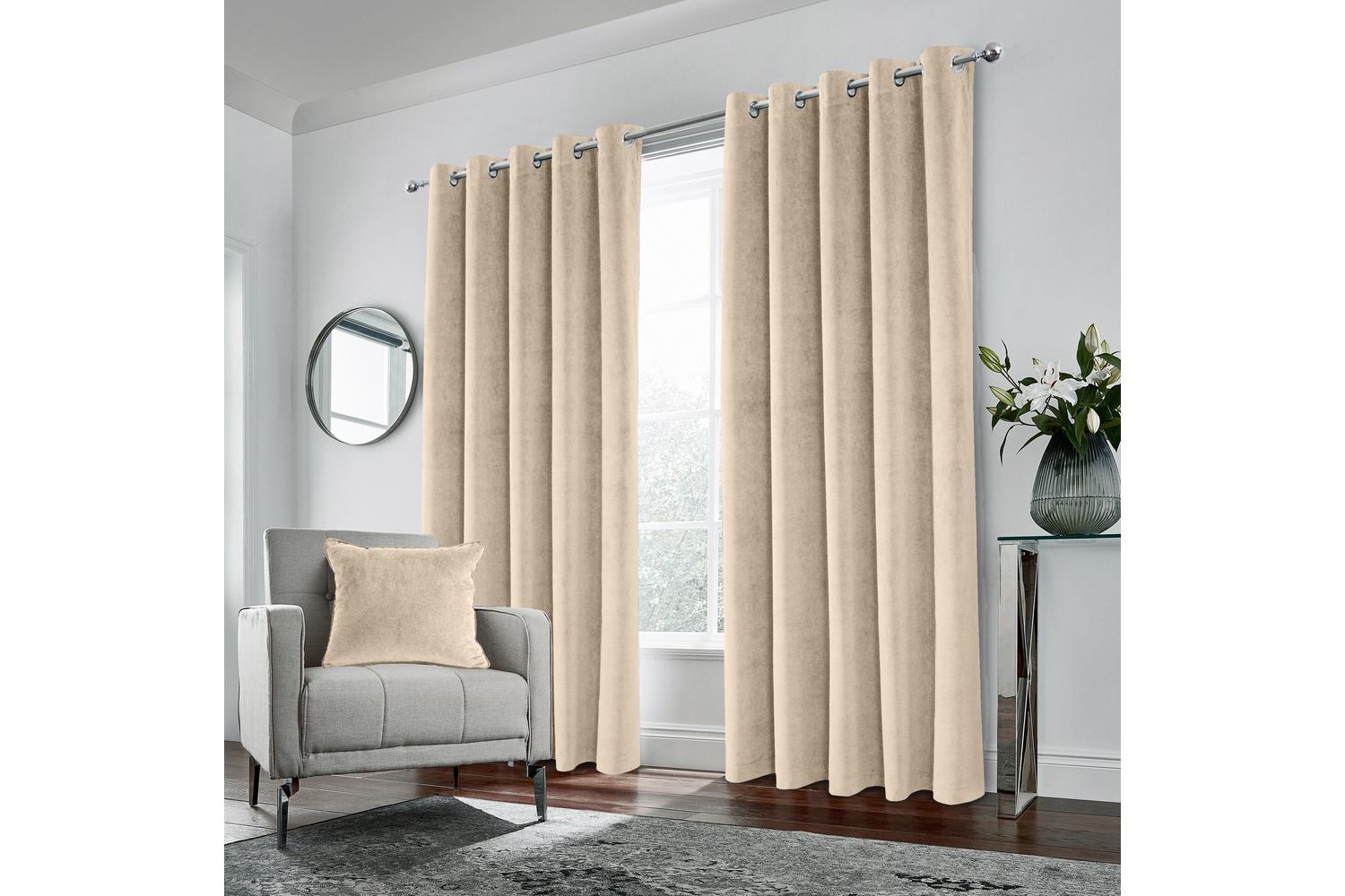 Experience luxury and superior comfort with the 46x54 Cream Velvet Eyelet Pair of 100 Blackout Thermal Supersoft Curtains 117x137cm from the renowned brand, TYRONE TEXTILES. Irish homes can now boast of a contemporary stylish appeal complemented by a distinctive cosiness that’s unique to velvet creations.