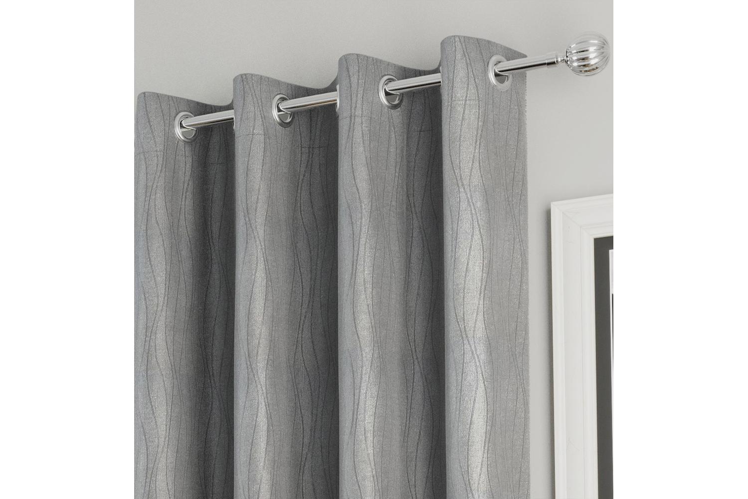 Indulge your living space with the Silver Eyelet Goodwood Pair of Room Darkening Thermal Energy Saving Curtains from TYRONE TEXTILES. Boasting an exquisite wave pattern and opulent silver radiance, these curtains reinforce an atmosphere of elegance and sophistication, while simultaneously offering cutting-edge thermal functionality.