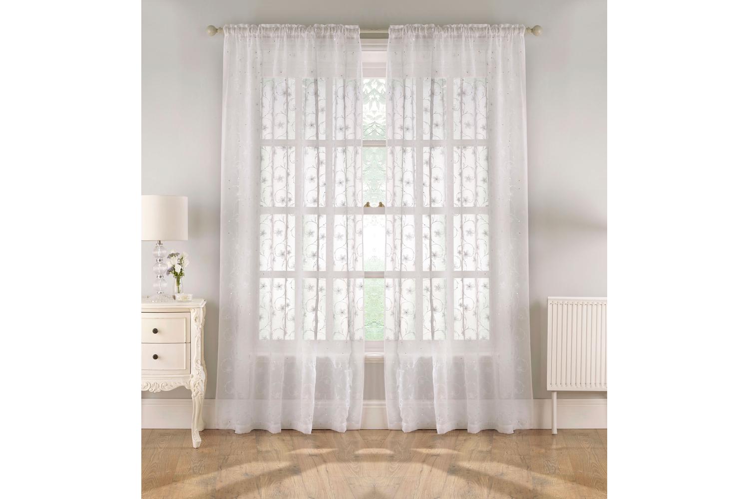Illuminate your spaces while honouring our natural beauty with the 55x54 White Rod Pocket Belle Pair of Sheer Floral Embroidery Voile Panels from Tyrone Textiles. This appealing home accommodating furnishing piece serves not only as a functional element in your favourite rooms but also as an art piece captivating the essence of good taste coupled with sophistication.