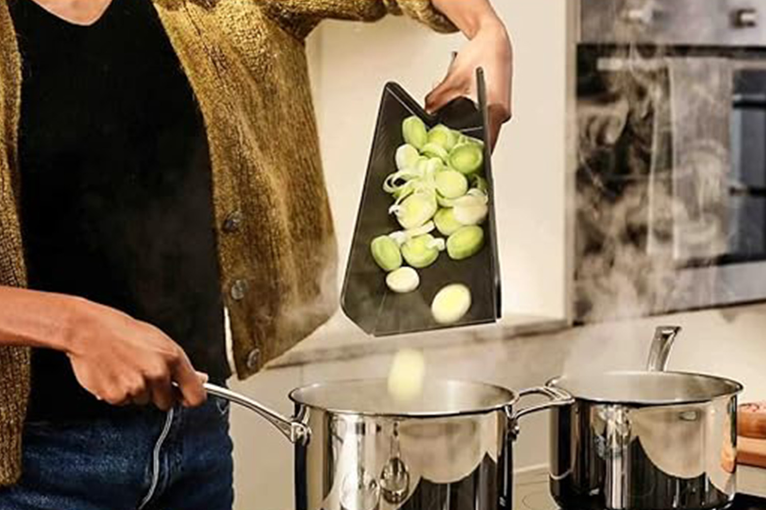 Considered a revolution in cutting board design, the Chop2Pot Plus Regular sports a pioneering folding build that ensures seamless and no-spill transfer of chopped food from board to pan, pot, or trash. This standout feature does not impede the basic functionality of the product as it lies flat providing a textured, knife-friendly cutting surface safeguarding your knives' sharpness and enabling versatile food prep.