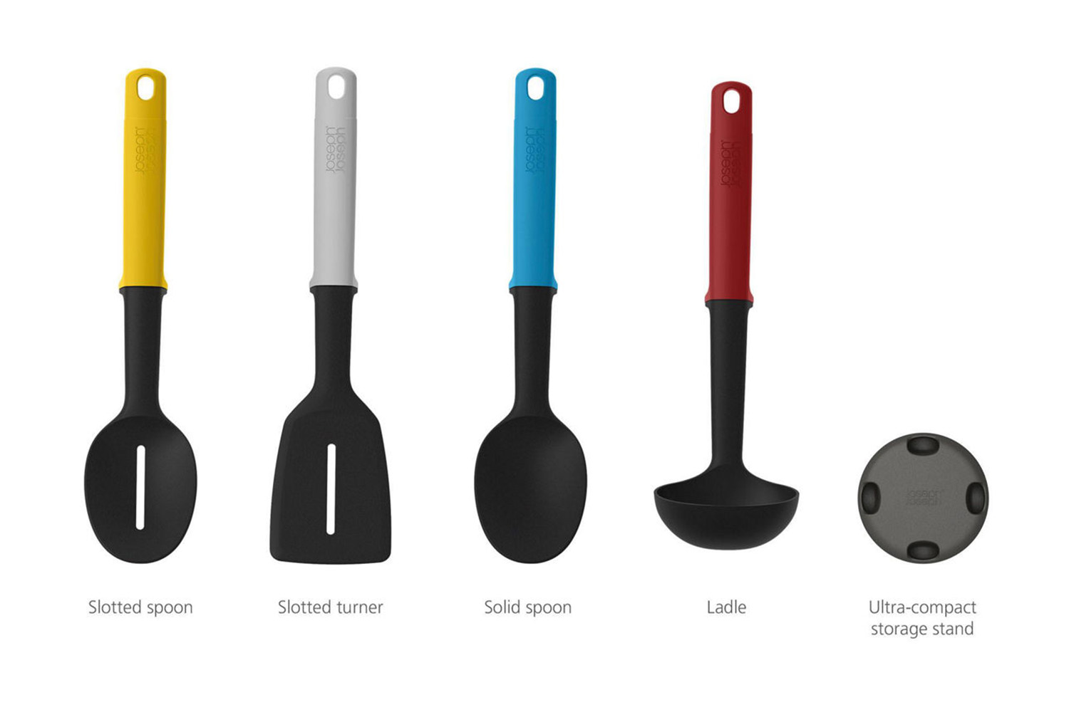 The set has everything you'll need to whip up a culinary masterpiece: a solid spoon, a slotted spoon, a slotted turner, and a ladle. Additionally, the included ultra-compact stand ensures that all your tools can be neatly stored after use, boasting a non-slip base for utmost stability.