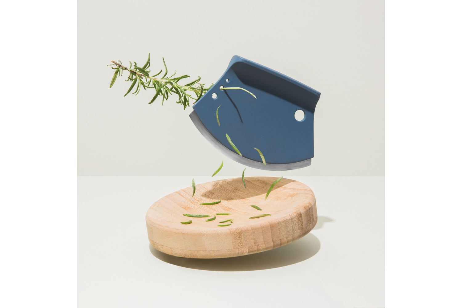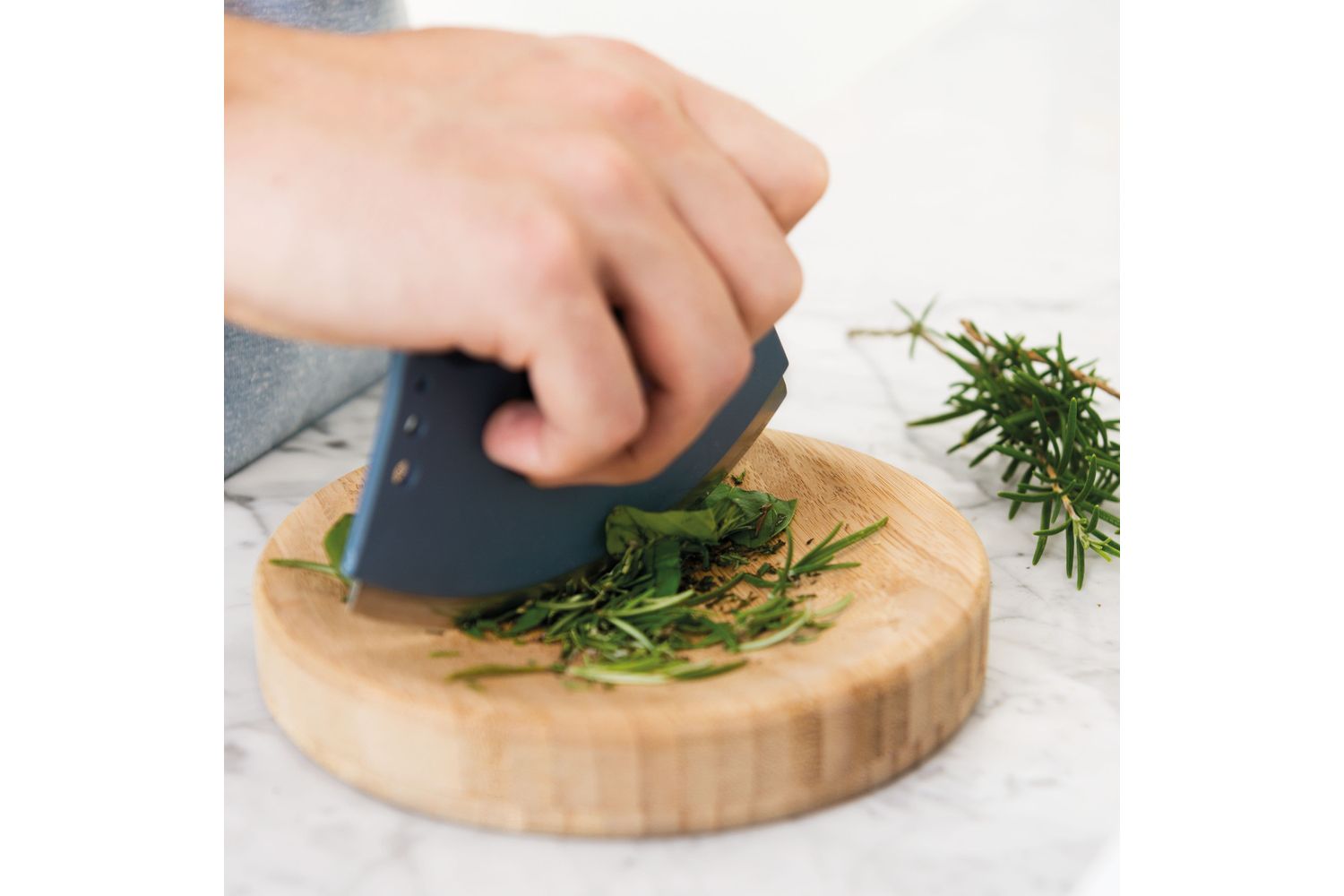 - Half-moon shaped stainless steel cutter for precise chopping and mincing