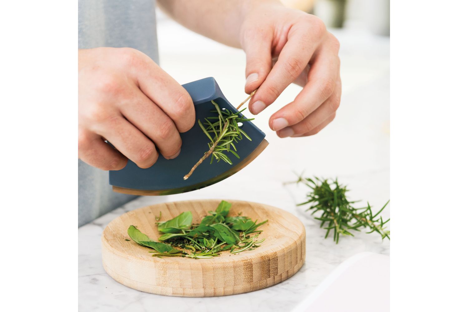 The set features a beautifully crafted half-moon shaped cutter and a concave bamboo cutting bowl, ensuring optimal comfort and control as you chop. The naturally antibacterial bamboo surface keeps your food safe, while the ergonomic design makes it easy to handle even the most delicate herbs. For tougher, stemmed herbs like rosemary and thyme, the built-in herb stripper with four different-sized holes lets you quickly remove leaves with a simple pull, saving you time and effort in the kitchen.