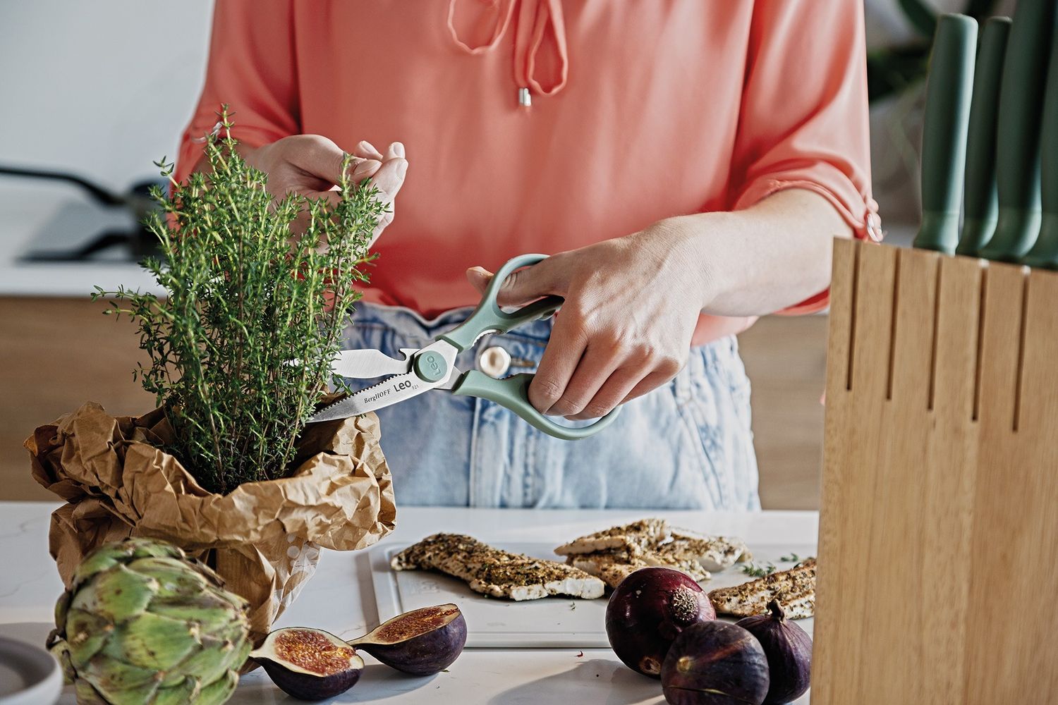 Featuring an ergonomic, non-slip handle made from durable ABS with TPE, these scissors provide a comfortable and secure grip, even during extended use. The vibrant green handle is not only stylish but also perfectly matches the Leo knife block Forest, adding a coordinated touch to your kitchen decor. Designed by Pieter Roex, the Scissors Forest blend modern aesthetics with practical functionality, making them a must-have for home cooks and culinary enthusiasts alike.