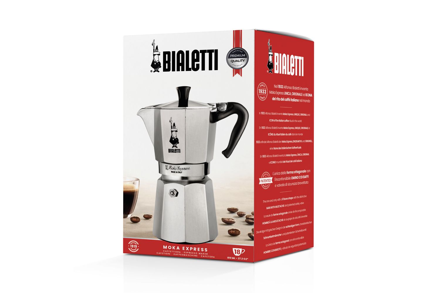 - Original Italian Moka Express coffee make by Bialetti with a capacity of 18 cups (approximately 885 ml).