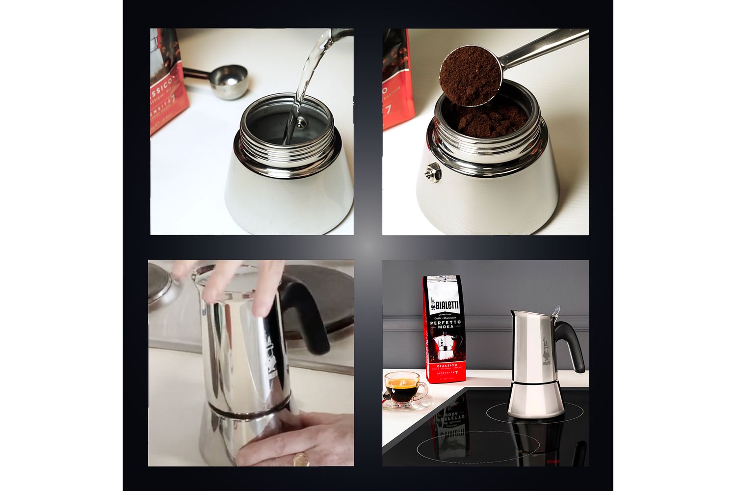 Brewing coffee is made effortlessly simple with this Bialetti product. Fill the boiler with water, add ground coffee in the funnel without pressing down, tightly close it and place it on your stovetop. After the brewing concludes, the mesmerizingly aromatic beverage is ready for your enjoyment. All this completes an unparalleled brewing experience this product prides itself on.