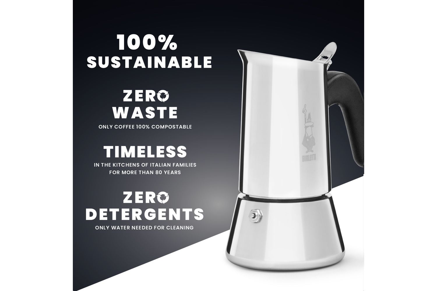 To ensure your Bialetti Venus lasts, it is advised that it be cleaned by gently rinsing it with water only. For removing coffee residue, refrain from using detergents that might ruin the stainless steel. Careful handwashing will serve to preserve its shine and the original flavour of your coffee.