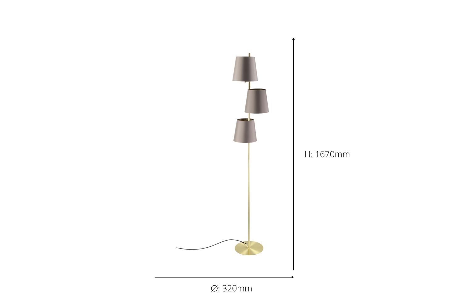 The elegant Cappuccino brass fabric floor lamp flaunts a stylish brushed brass finish, perfectly paired with three conical fabric shades in a timeless cappuccino tone. The sophisticated shades exude warmer light for a cosy ambiance in any living room, bedroom, or hallway, creating a homely atmosphere beloved by everyone.