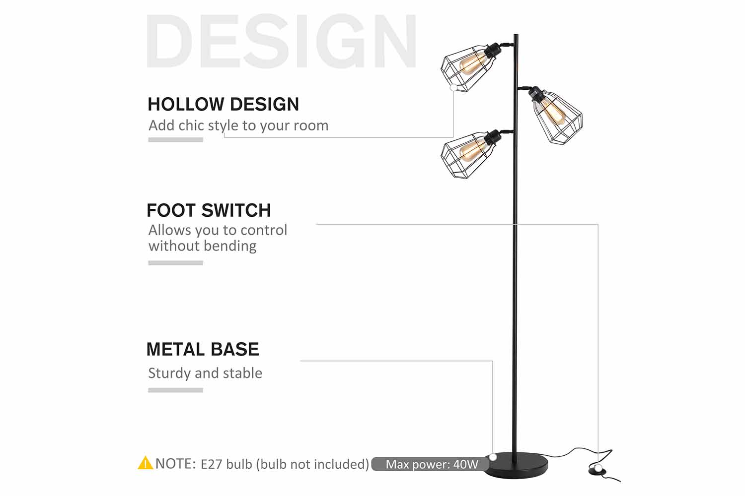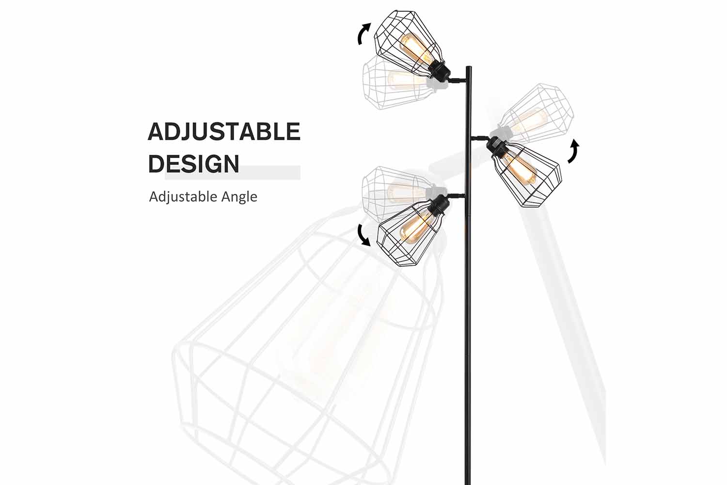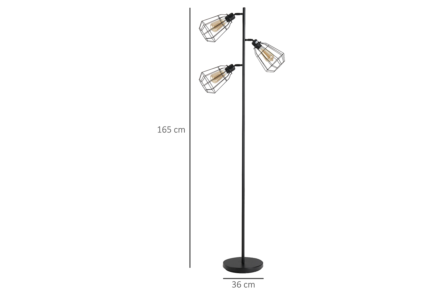 Bring beautiful industrial styling into your home and beyond with this floor lamp from HOMCOM. Using steel for the tall and slimline frame, it features three lights, all protected by a large birdcage shell for safety. Each light can be moved up/down and left/right allowing you to illuminate towards any position needed. The base is round and wide to keep the structure upright, and it is finished with a foot switch to turn it on and off easily.