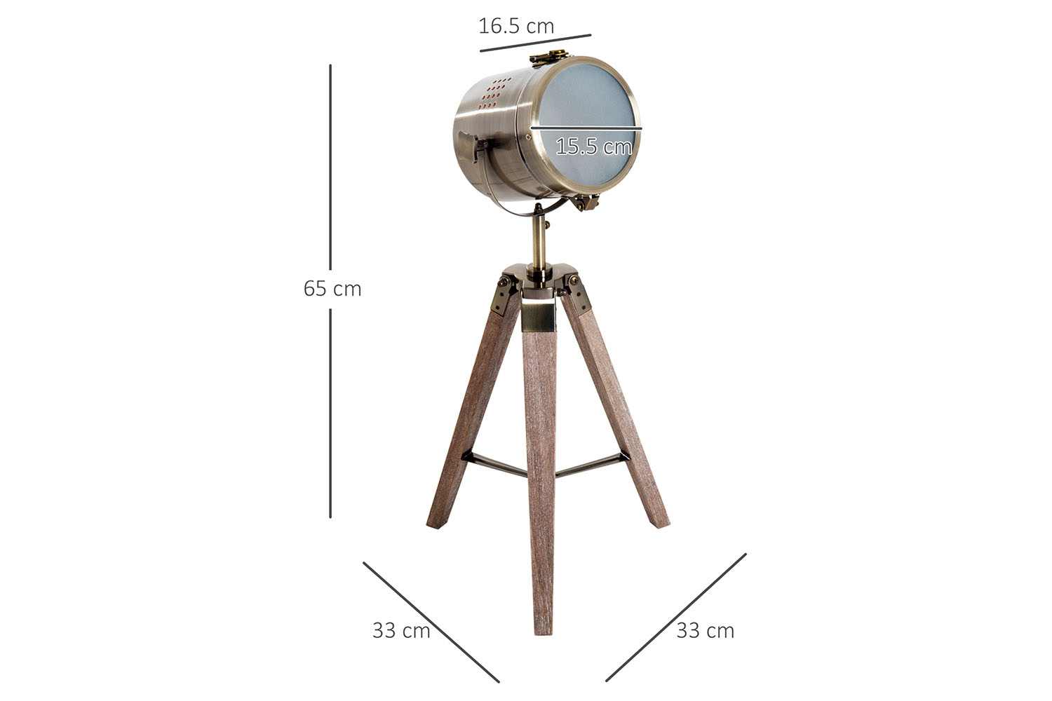This industrial style tripod table lamp from HOMCOM comes with solid pine legs in dark wood colour and a retro photography style lamp head. The tripod base can fold compact for easy transportation and space-saving storage when not in use. The lamp head is full adjustable so that you're able to choose an ideal direction to light up your bedroom, study room, lounge and more. Copper finished shade with IP20 rated materials ensures long term use while making a statement in any home decor.
