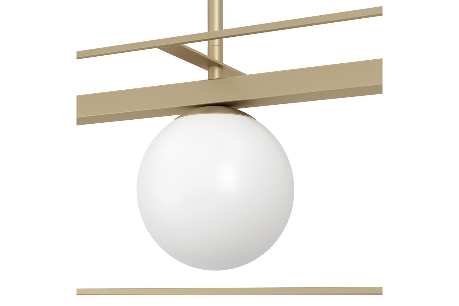 Encased within a suspended cube-shaped frame finished in champagne colour, the Vallaspra pendant features four matte white opal glass spheres. These elements combine to produce an enchanting light display, capturing the essence of modern lighting design. Revel in the delicate ambiance that radiates into every corner of the room, creating an inviting space for lively conversations, hearty meals, and complete relaxation.