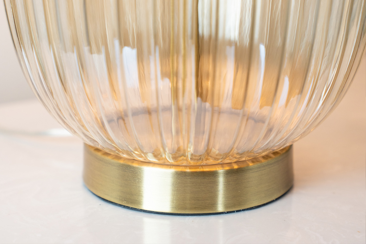 Bring texture and tailored elegance to your space with the Amia refined glass table lamp. The base features vertically ribbed clear glass, creating subtle dimension and a beautiful play of light and shadow when illuminated. Its structured cylindrical silhouette offers a clean, modern profile, while warm brass accents at the next and