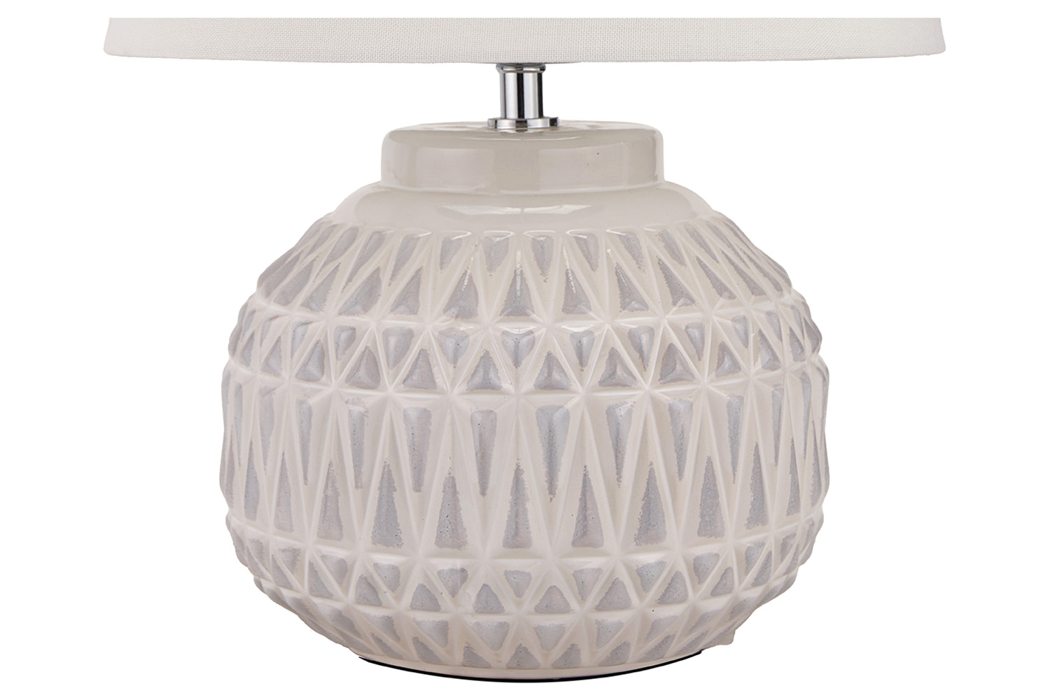 Add an element of refined excellence into your home with the exquisite white ceramic table lamp. Illuminating your home with style and class, this lamp features a bulbous base inlaid with an intricate geometric design. It includes a white lampshade that elevates this look further. Also available in bronze.