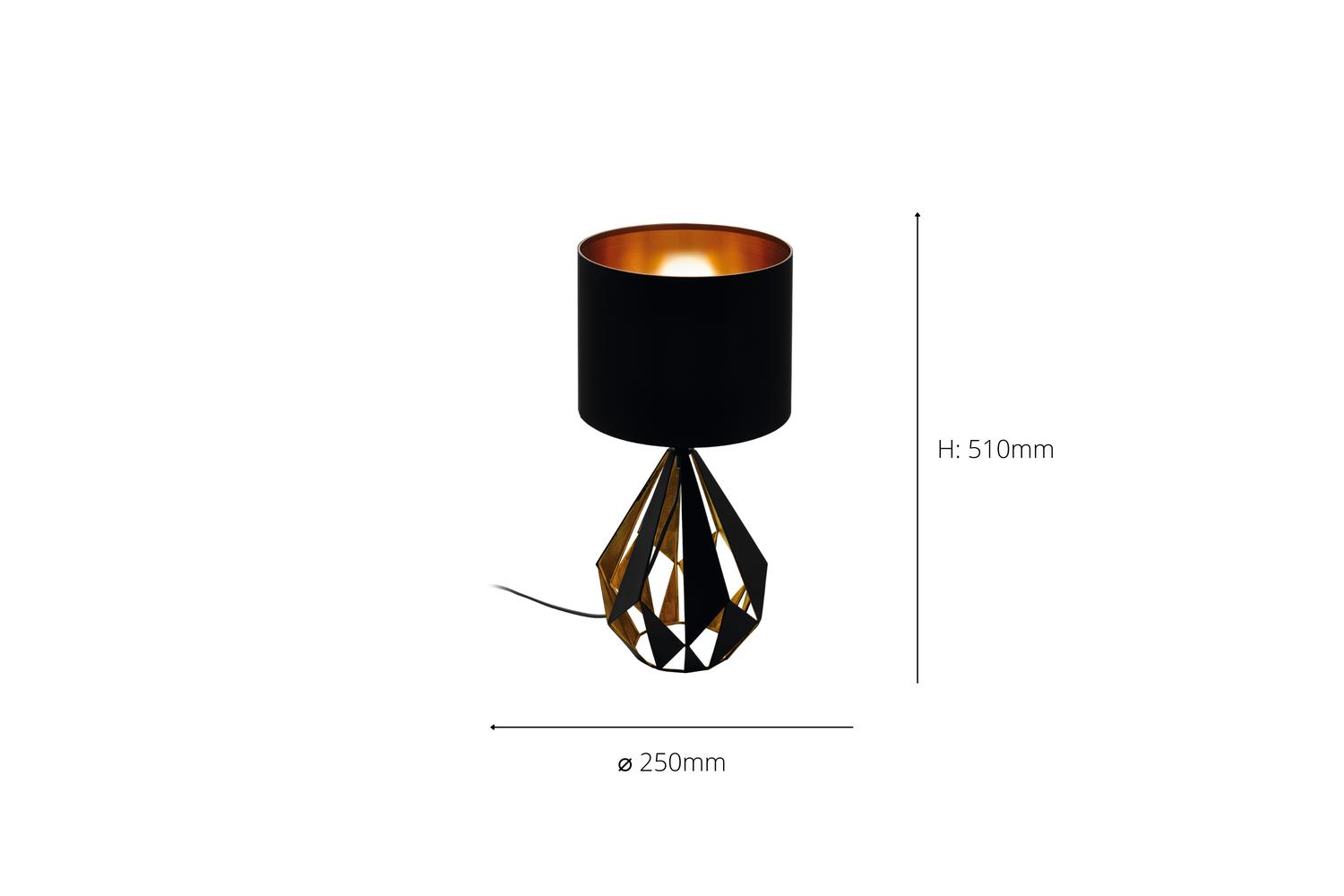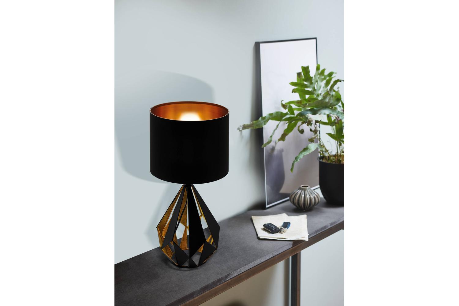 Introducing the EGLO Carlton 5 1-Light Geometric Black and Copper Table Lamp—a statement design guaranteed to enhance any living space. Inspired by geometry, this table lamp makes a bold contemporary style statement with its dynamic diamond-shaped metallic base and round black fabric shade.