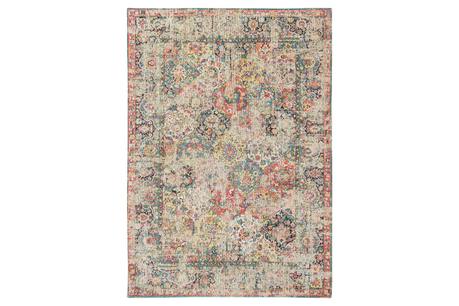 Inspired by the designs of the Bakhtiari tribe of Iran, the Eco Bakhtiari rug features a vintage-style intricate pattern carefully woven together to form an expansive floral diamond design. With muted hues of blue, green, red, and yellow and additional floral details all add further texture and interest while giving your home a pop of colour. Artfully distressed, this rug will add a chic, vintage touch to any interior.