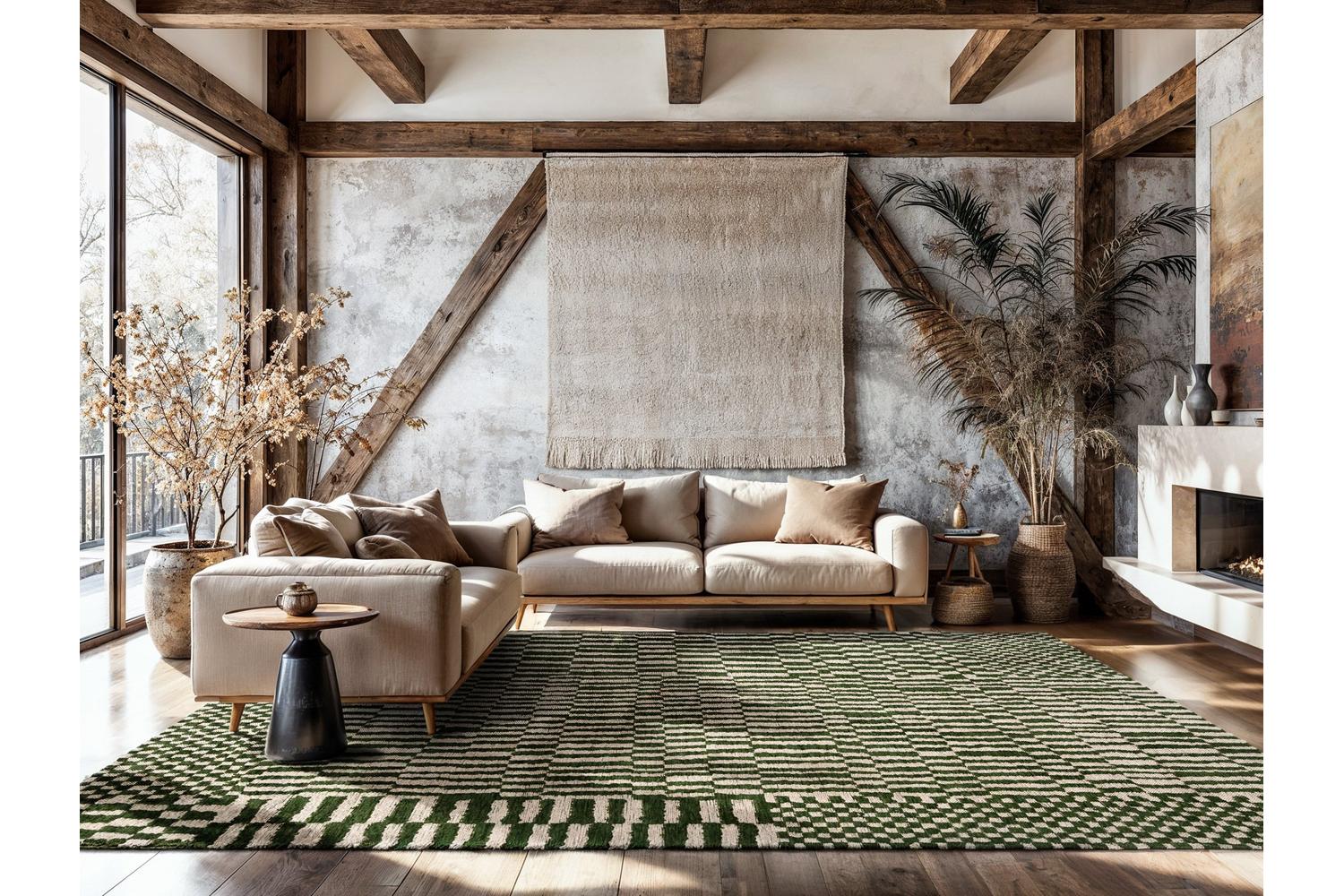 An exquisite combination of vibrant green hues aptly named "Oasis", this rug is a contemporary reimagination of ancient Beni Ouarain weaving techniques. Built on a minimalist design with bold color contrasts, it captures the traditional artisan essence, succeeding in bringing a fresh burst of modernity to any space.