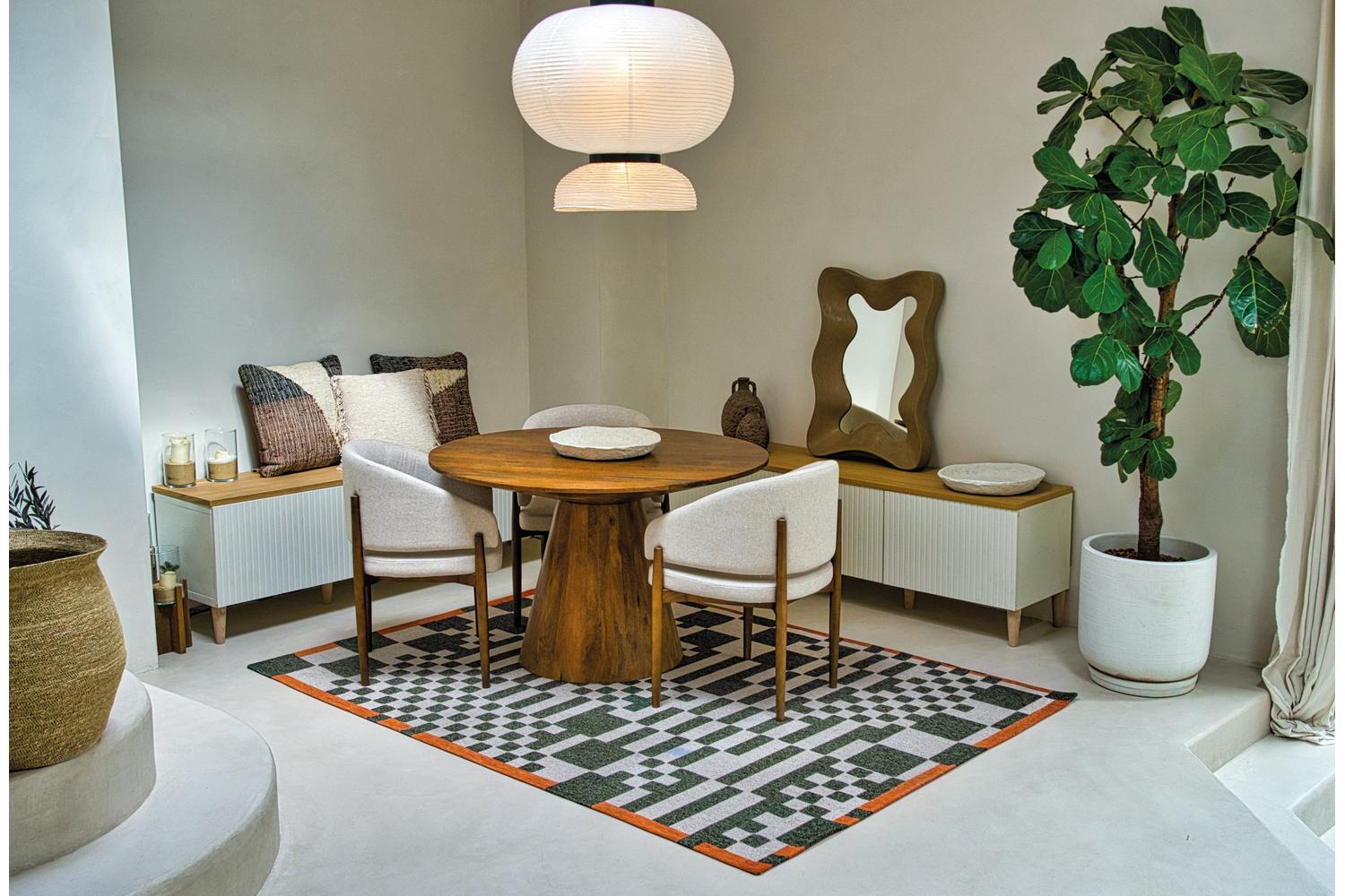 Delicately woven with a mechanically Jacquard Flatweave crafting process and crafted from 100% pure polyester fibres, this rug is robust, stain-resistant, and remarkably tactile. The PES anti-slip latex backing offers enhanced stability and safety, making it a practical and elegant addition to your living space. Furthermore, the rug's harmonious colour palette and intriguing design elements bring to your home a timeless allure that complements any property, from contemporary apartments to traditional villas.