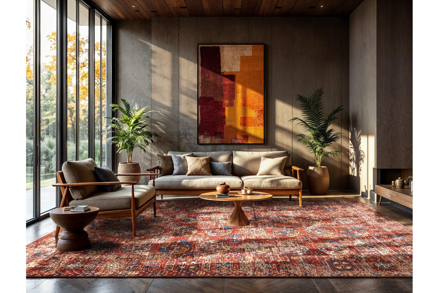 Juxtaposing a rich palette dominated by hues of red, earthy tones, and ivory with a modern aesthetic, the rug seamlessly weaves together past and present through its reflective design.The striking juxtaposition of colour and pattern, coupled with the rug's construction from 100% polyester materials, adds visual depth and texture to any interior space. A perfect blend of heritage and contemporary design, this rug embodies our little acts to balance tradition and modernity.