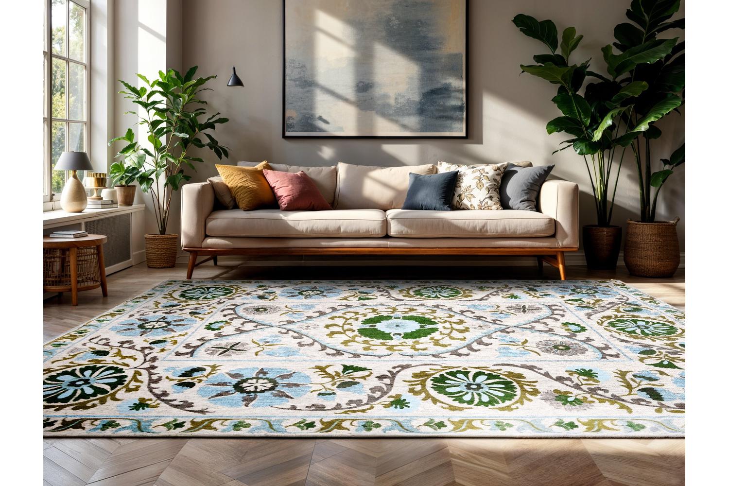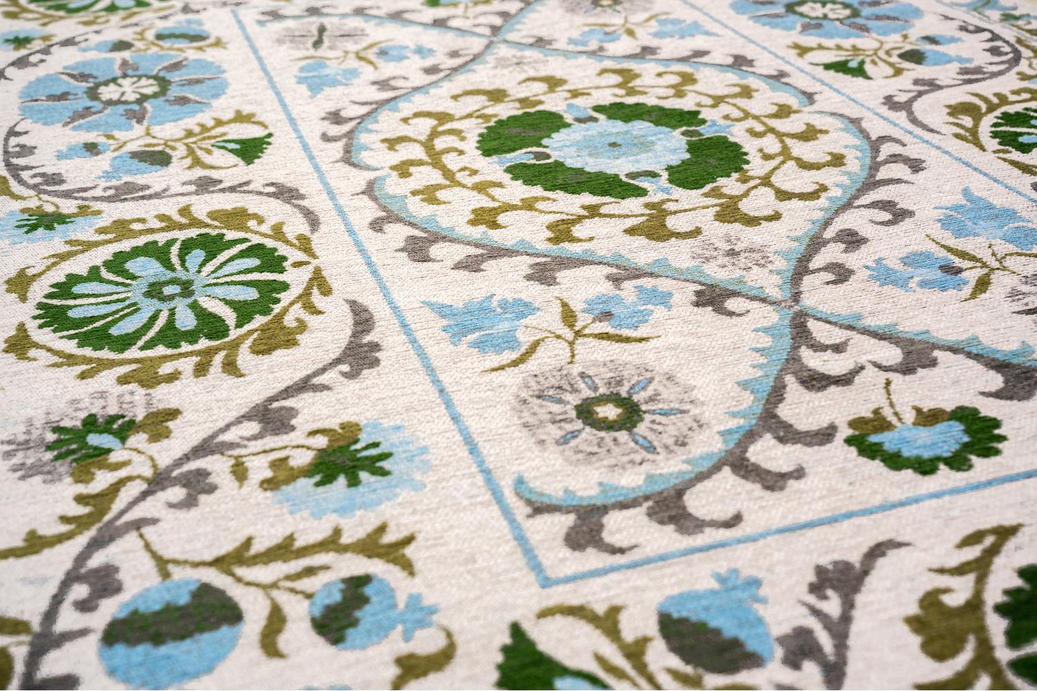 The Slavia Rug, measuring 200 by 280 cm, reflects the rich hues of traditional Central Asian embroidery. The proud inheritance from the ancient Suzani collection, it entwines elements of classic designs, evolving into a vibrant reimagining of tradition. With curated motifs infused with profound cultural significance, this rug captures a part of history and adorns your space with it.