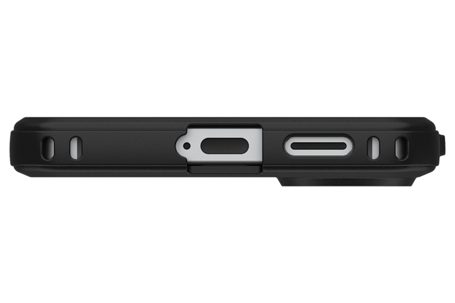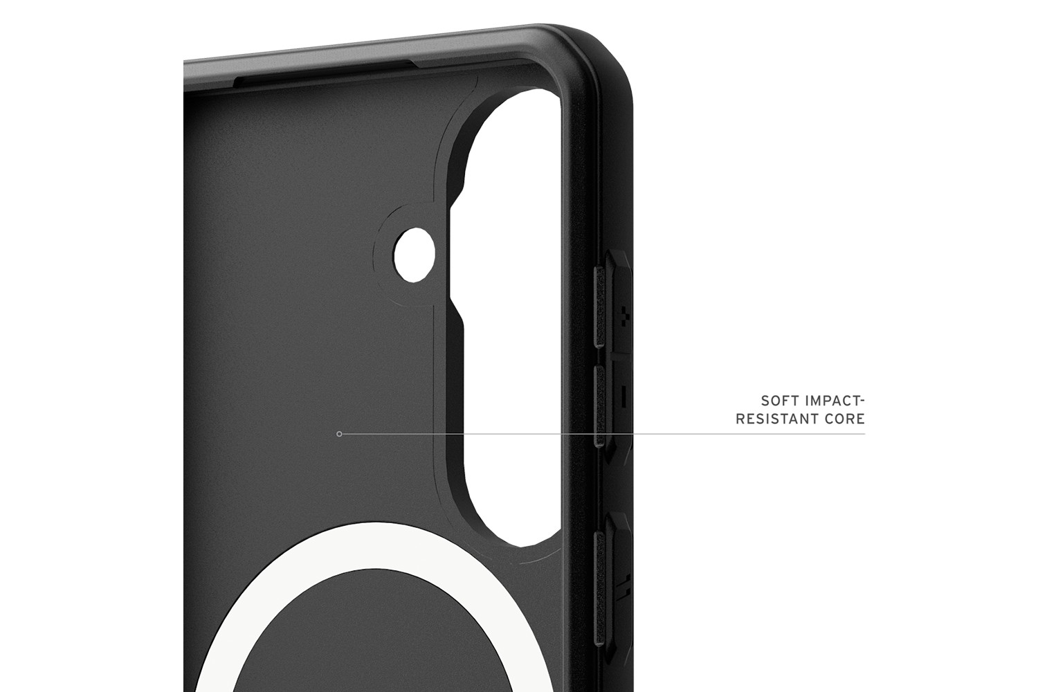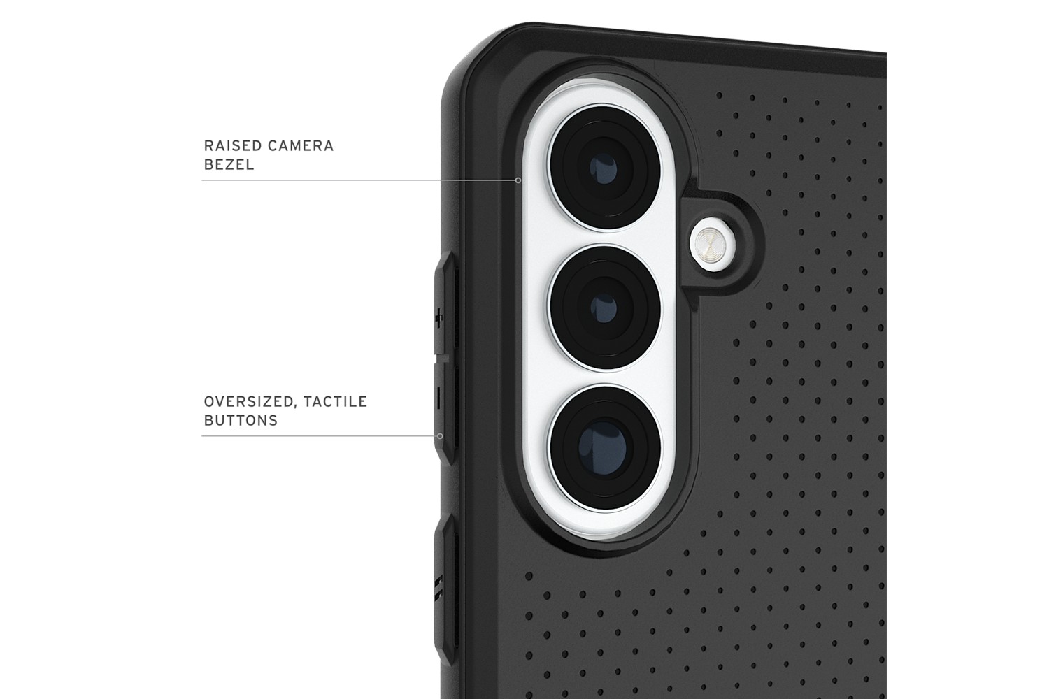 Co-mold construction for added impact absorption. Anti-slip traction grip for daily rugged use. Oversized tactile buttons.