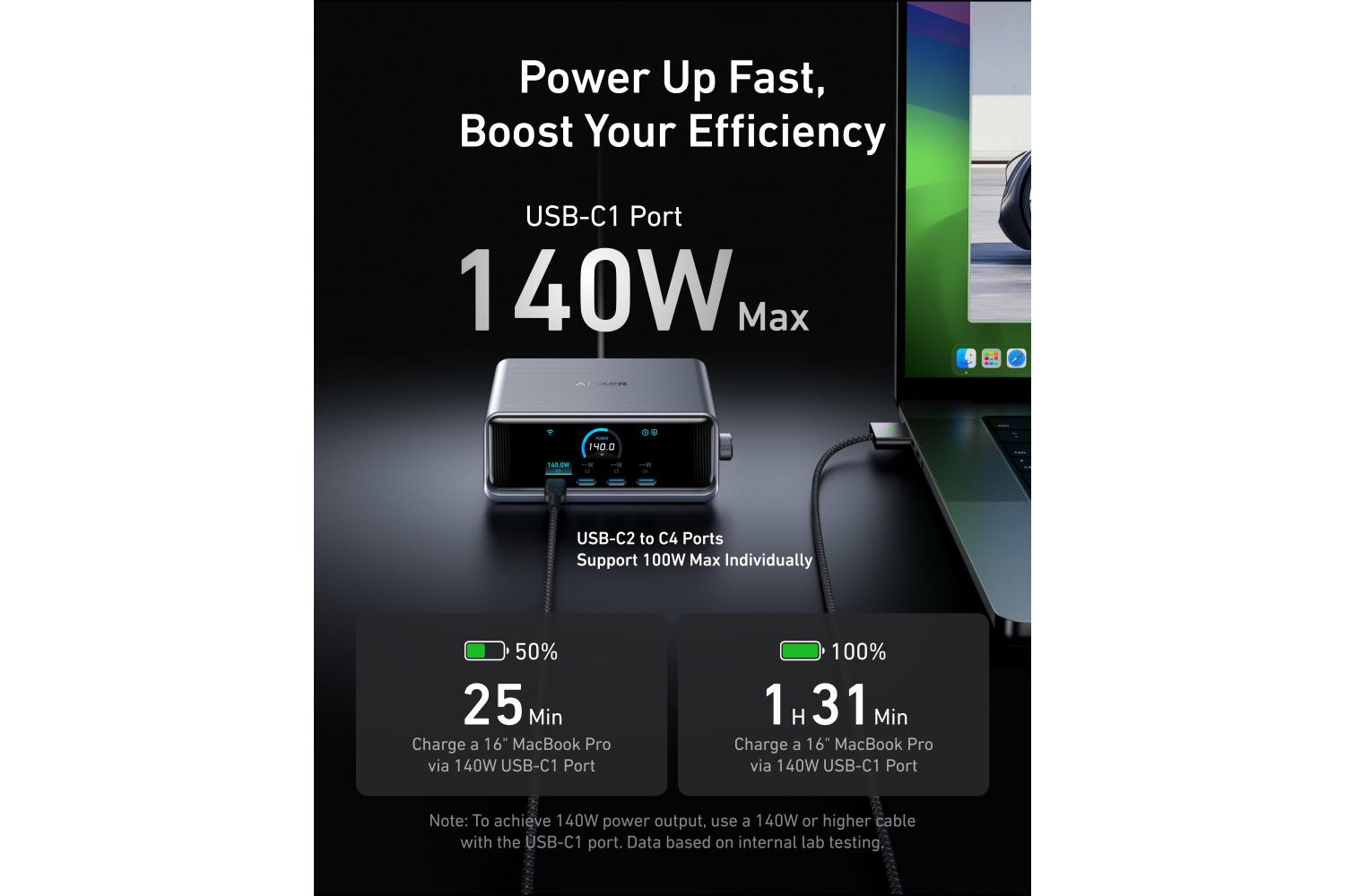 Power up your 16-inch MacBook Pro to 50% in just 25 minutes using the first USB-C port, which delivers 140W to significantly boost your productivity.