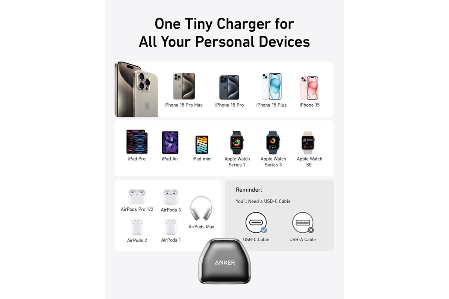4. Use a USB-C to Lightning cable for Lightning devices (iPhone / iPad) and use a USB-C to USB-C cable for USB-C devices (such as Samsung phones). Cables sold separately.