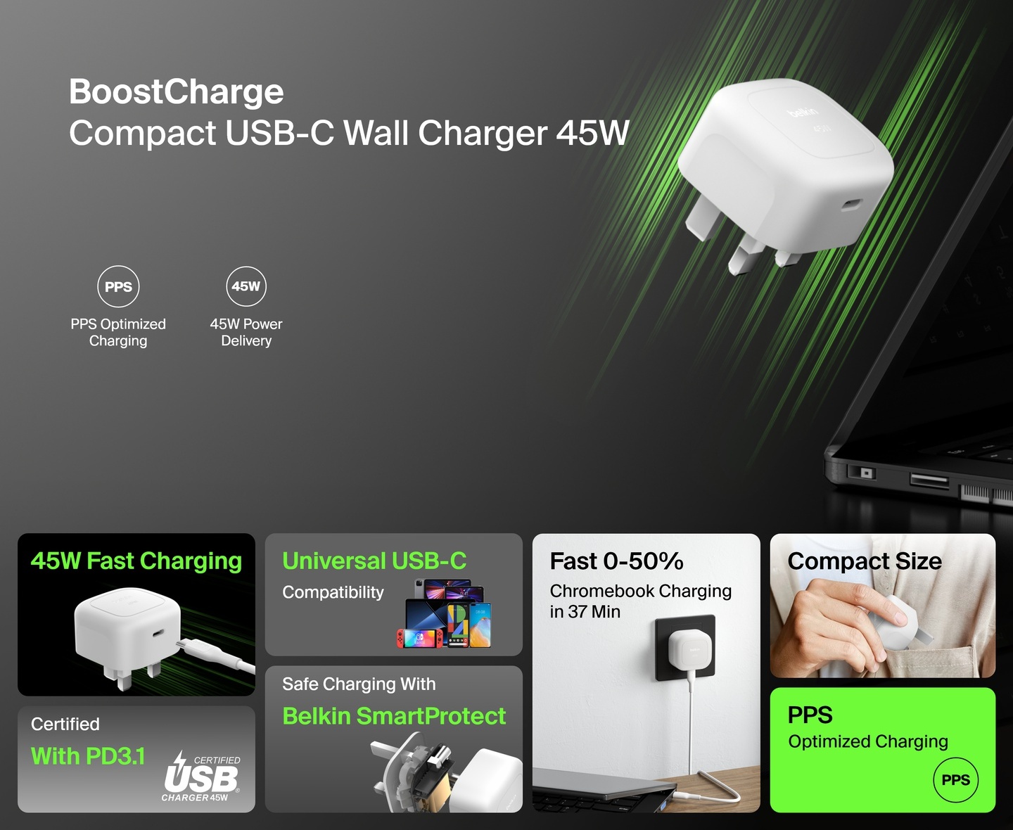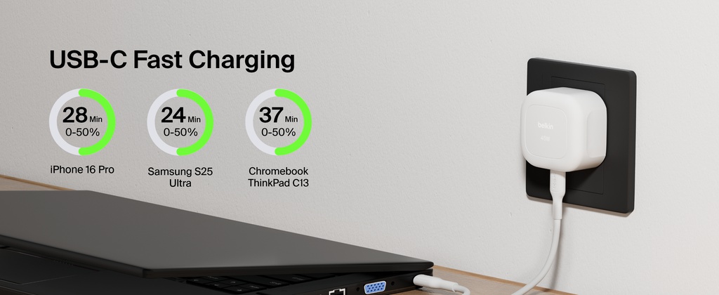 Charge your iPhone and iPad with Belkin powerful, ultra-compact 45W USB-C wall charger. It includes USB-C PD 3.1 and PPS charging technologies, delivering a fast and safe charge.