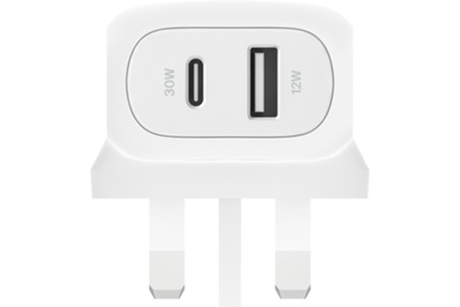 Two ports allow for dual charging. Belkin Wall Charger has a USB-C port (30W max) and USB-A port (12W max) to charge two compatible devices at the same time.