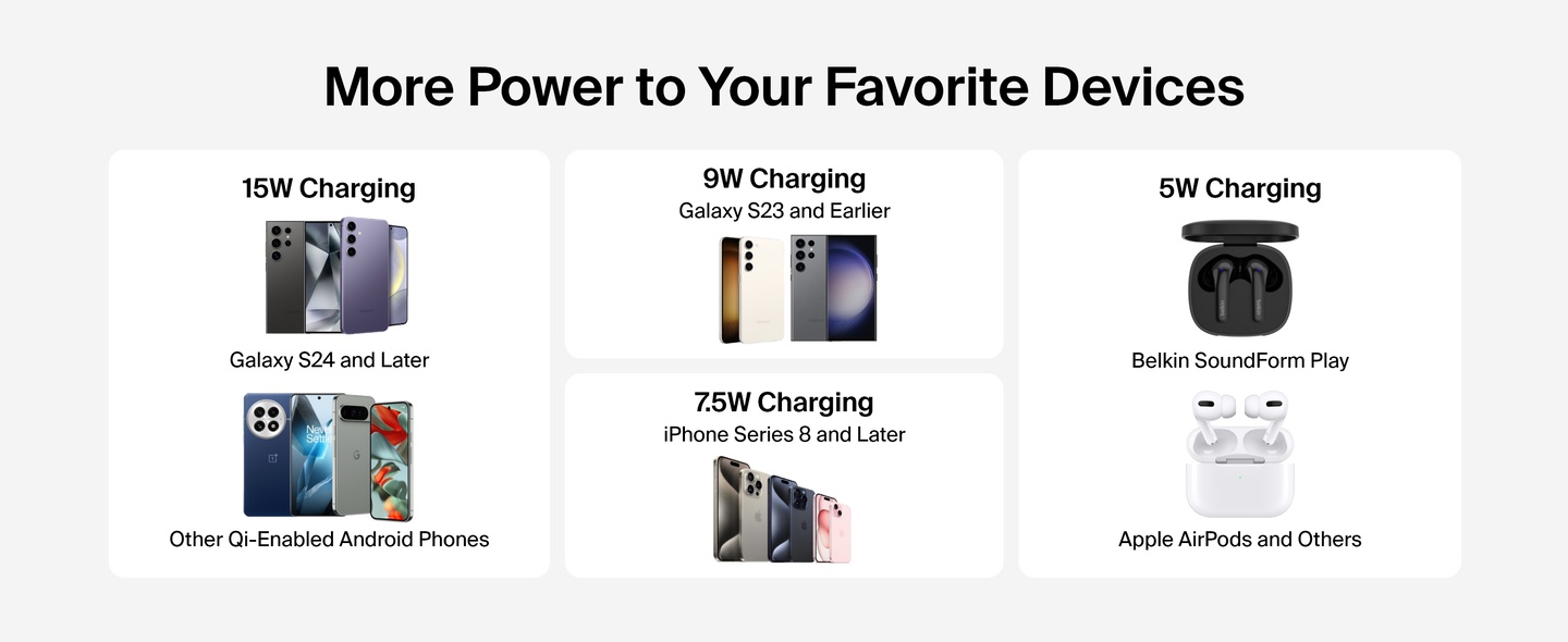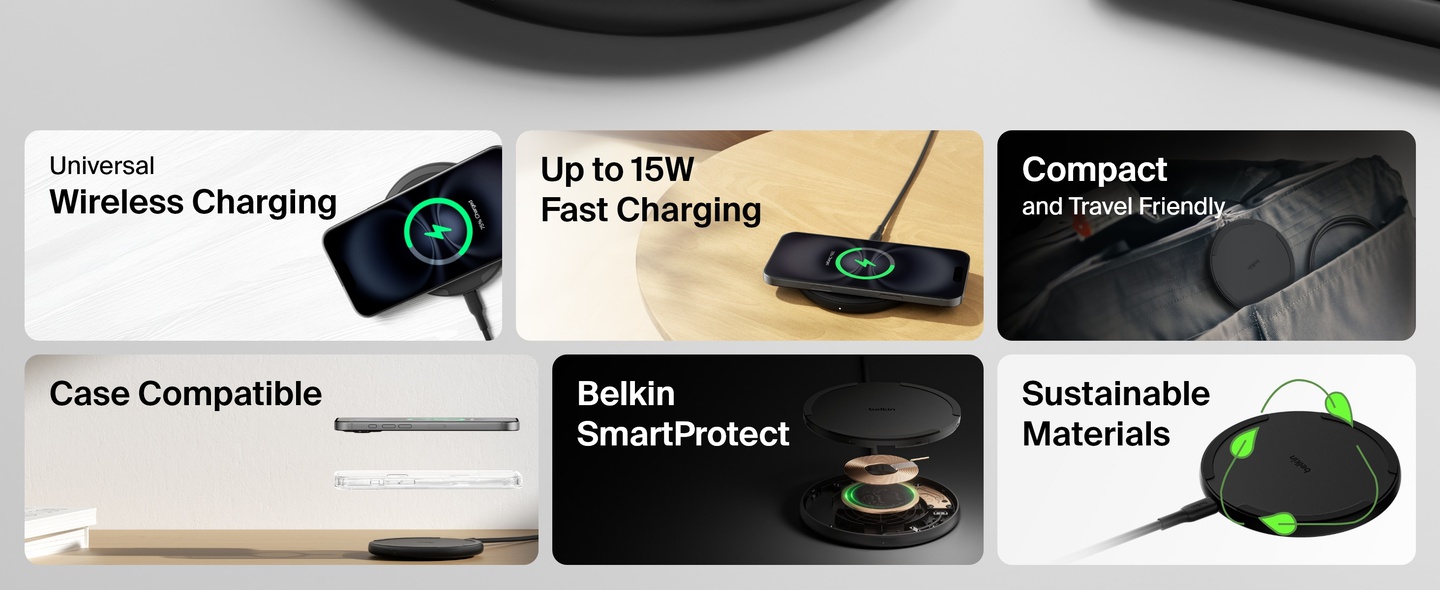 Enjoy a convenient phone or earbuds charging experience with Belkin Wireless Charging Pad with Qi. Offering up to 15W fast wireless charging, this sleek and efficient pad ensures your device is ready for use. It’s the perfect addition to your desktop for seamless and stylish charging.
