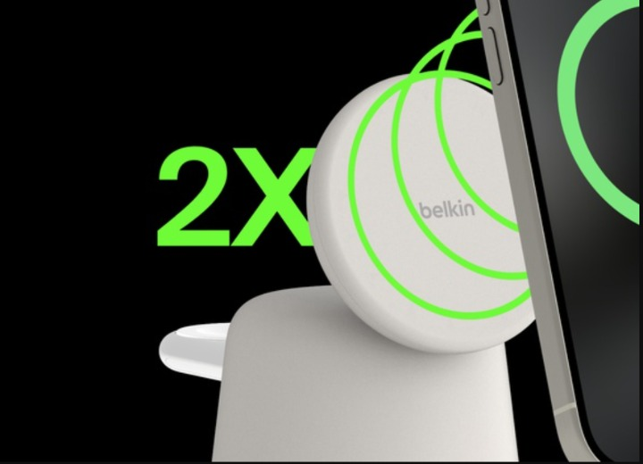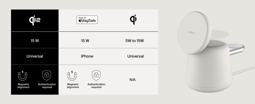 *Based on internal testing. Belkin Qi2 15W wireless charger charges iPhone 15 from 0-50% up to 2x faster than a Qi 5W wireless charger and up to 1.5x faster than a Qi 7.5W wireless charger.