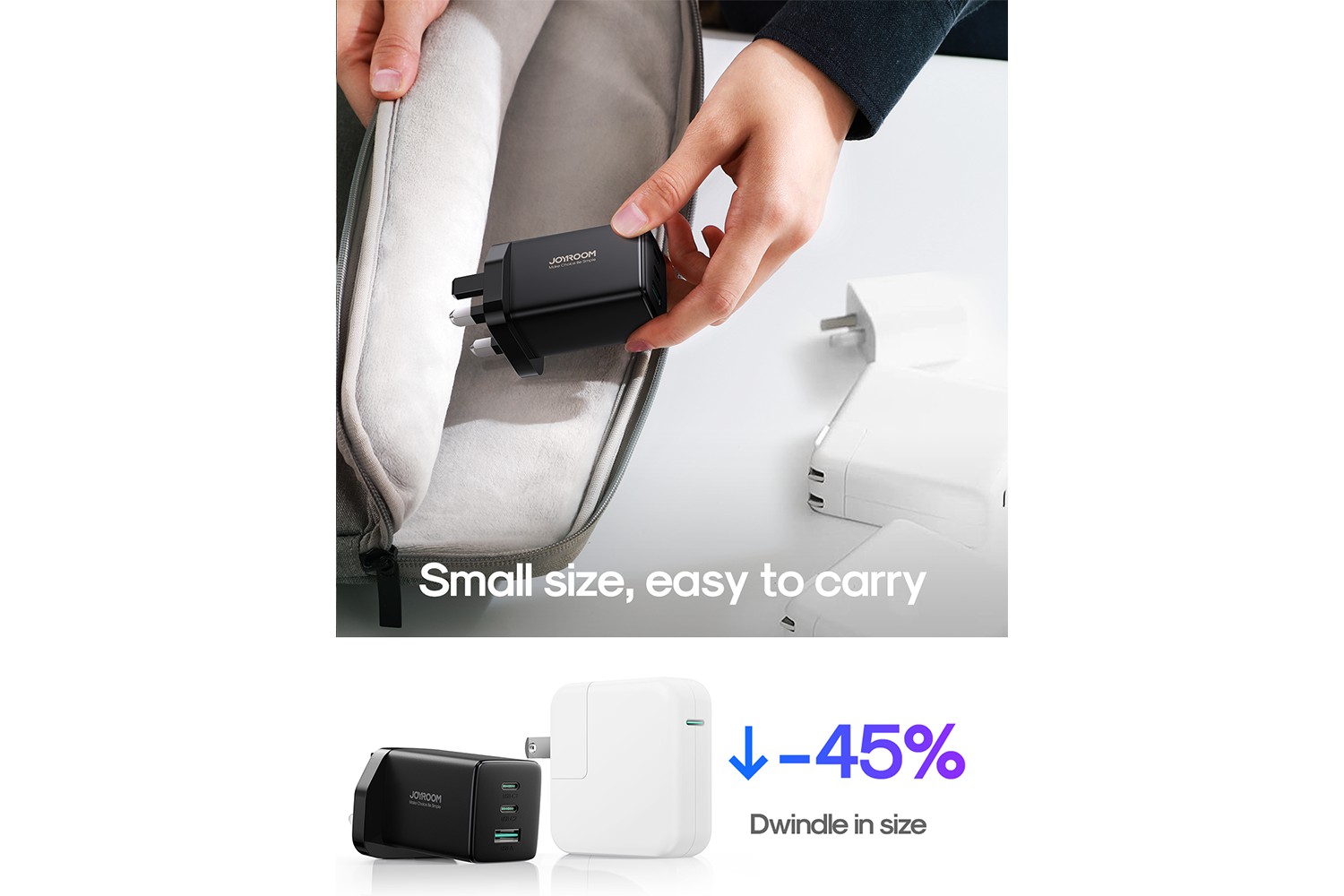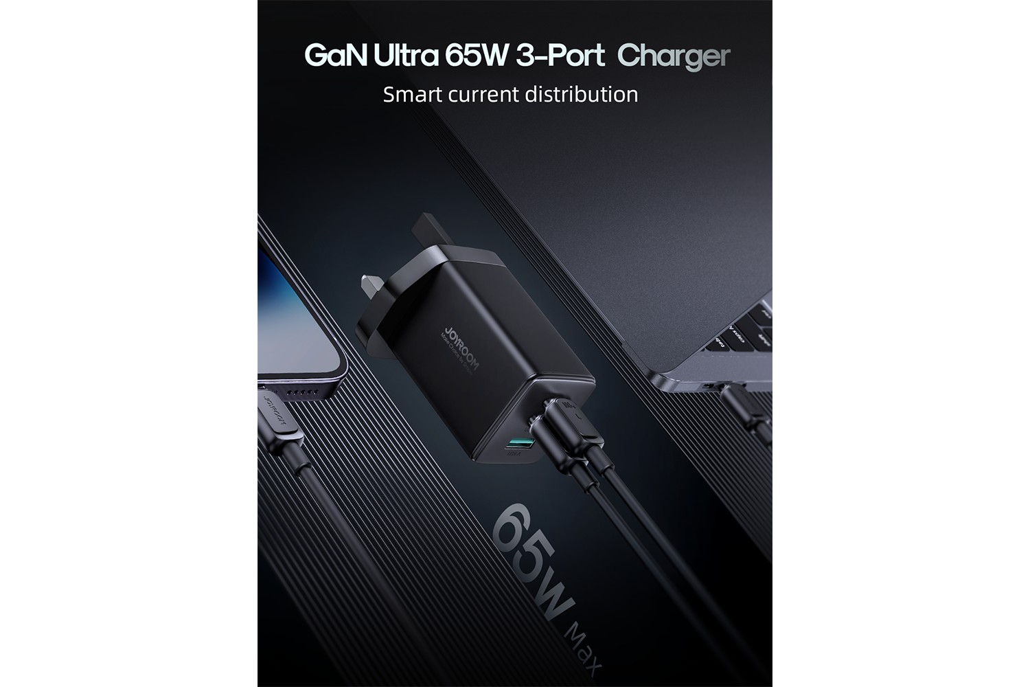 65W high-power output charger. It has 3 ports to provide fast charging for 3 devices simultaneously. It is compatible with various laptops, tablets and phones. The PD3.0, PPS, QC3.0, Samsung AFC, Huawei FCP/SCP superfast charge protocols are supported. Its small size and foldable plug make it super easy to carry. It adopts the most advanced highly integrated semiconductor material – GaN chip, ensuring stable charging with less heat. CCC/CE/FCC/RoHS certifications are passed to guarantee charging safety.