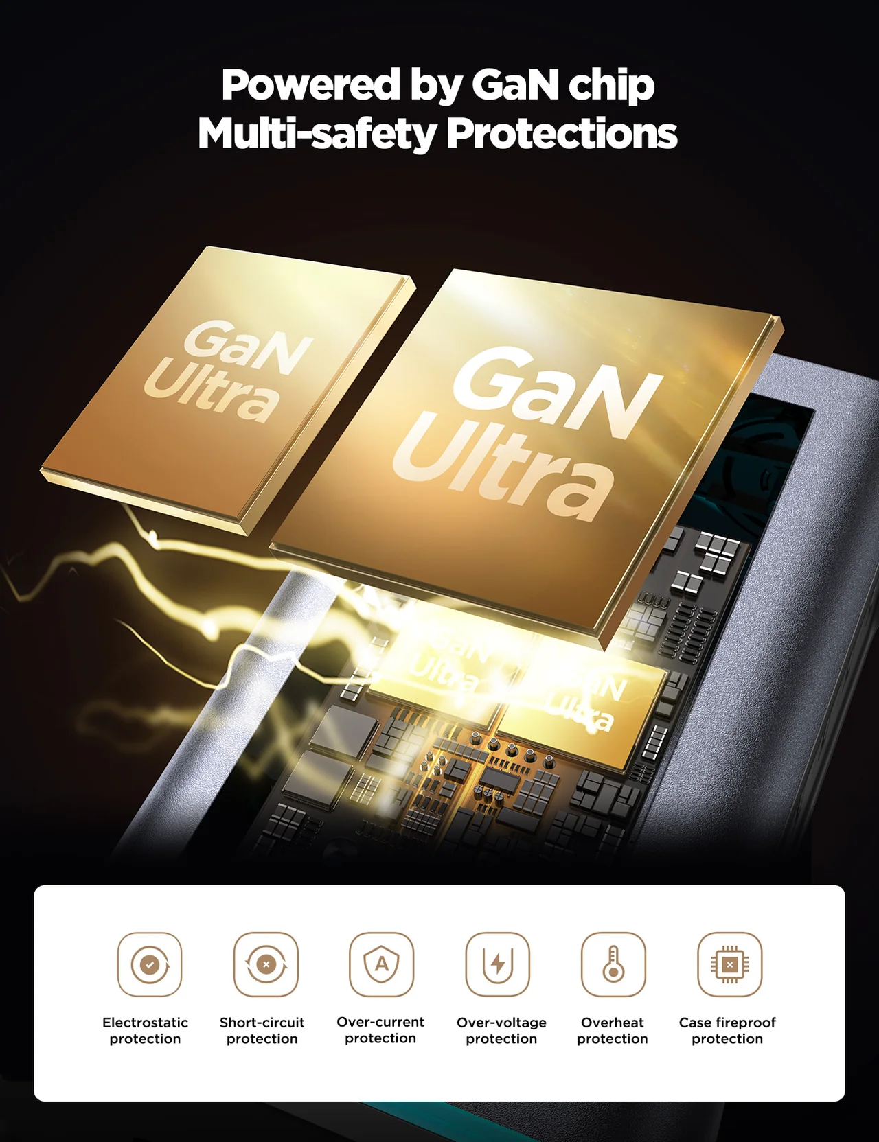 Adopts the latest GaN chip, ensures stable charging with less heat.