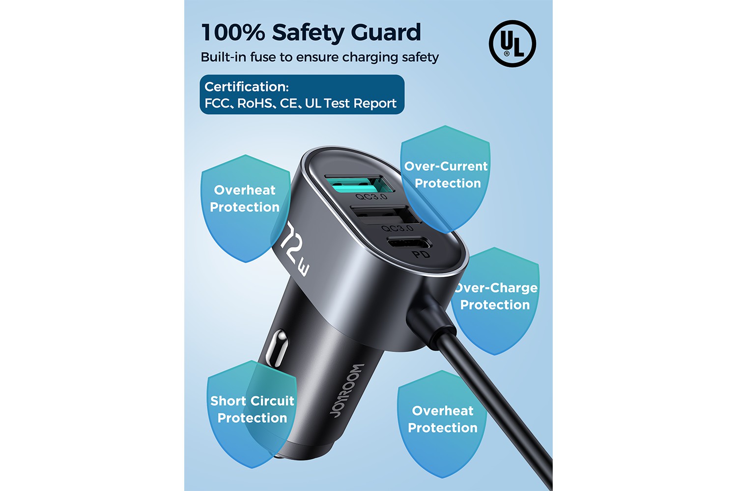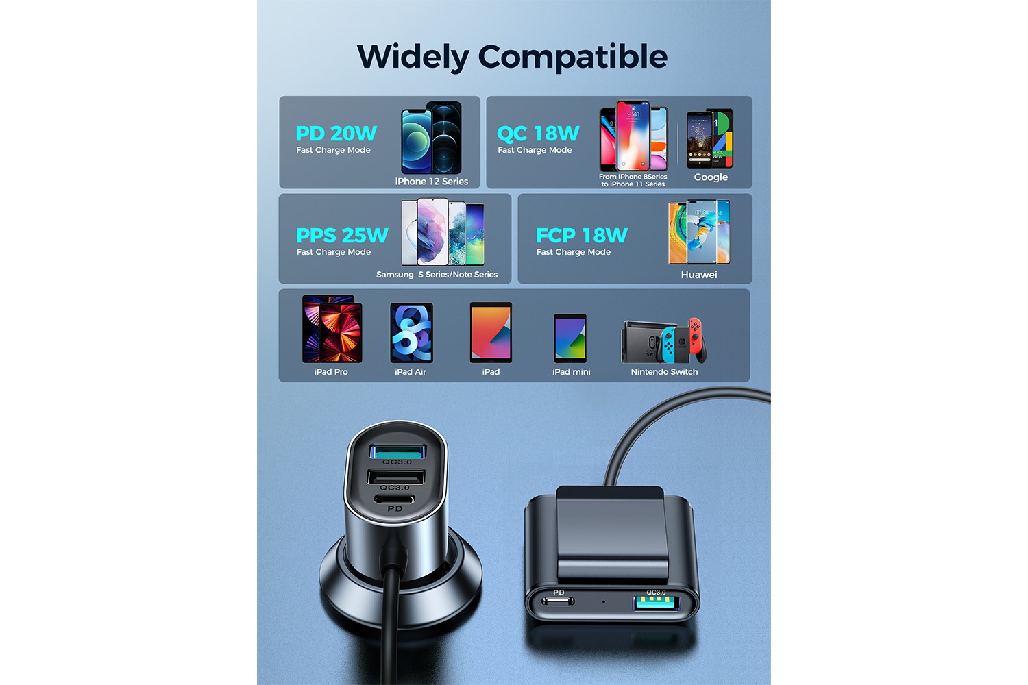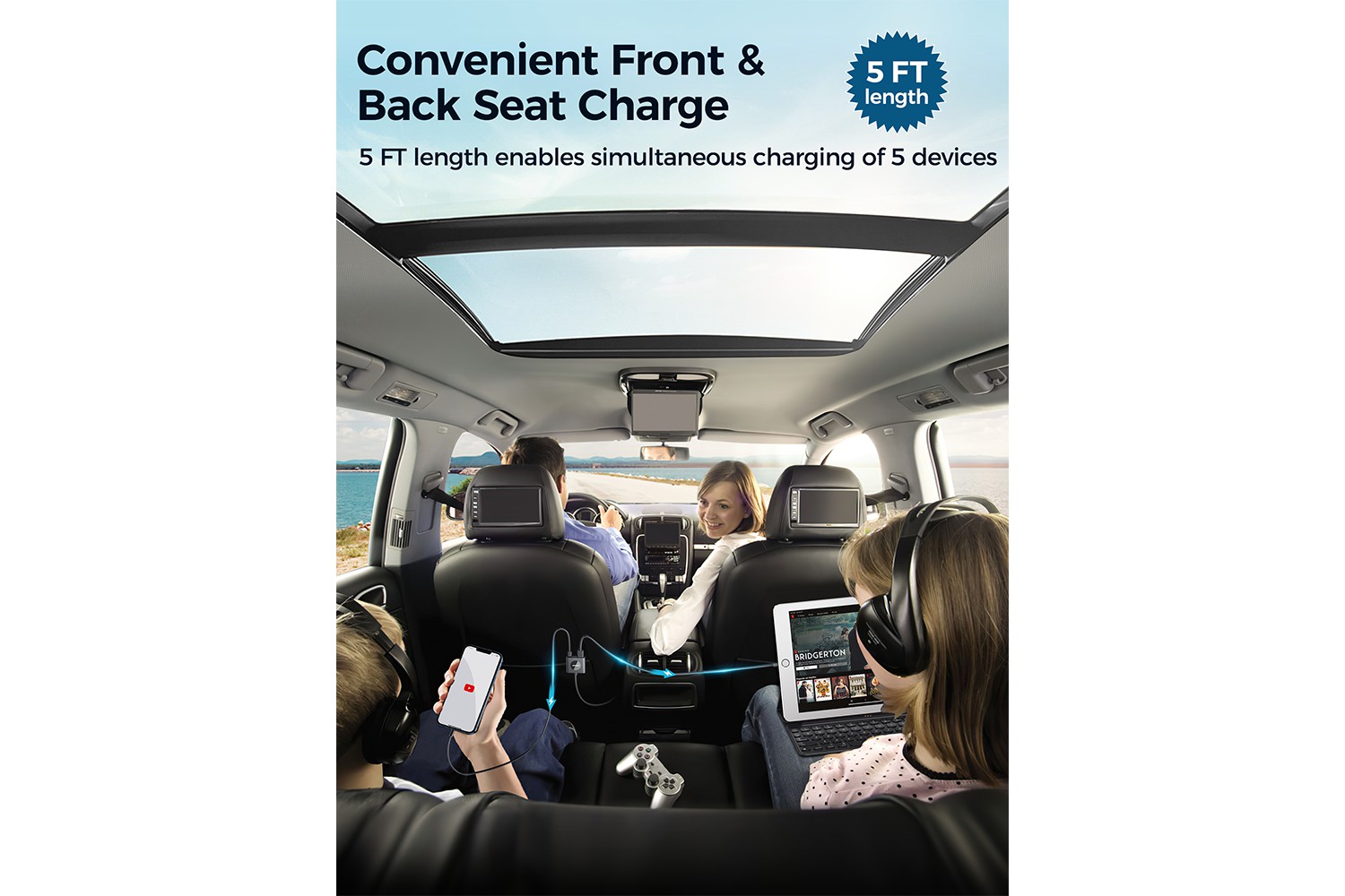 • 1.5m extended cable, easy to charge the devices from front to back seat.
