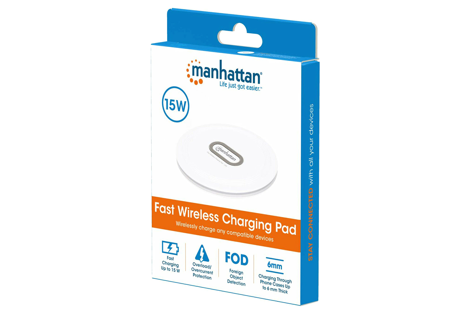 This Manhattan power solution charges through phone cases up to 6 mm (0.24") thick. If you place a metallic item like a key on the charging area, the Foreign Object Detection (FOD) mechanism will automatically shut off the charger. The nonslip rubber helps to grip your phone, keeping it safely in place while charging. Plus, overload, over current and overheating protection guarantee maximum safety.