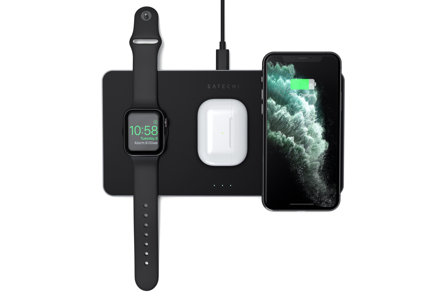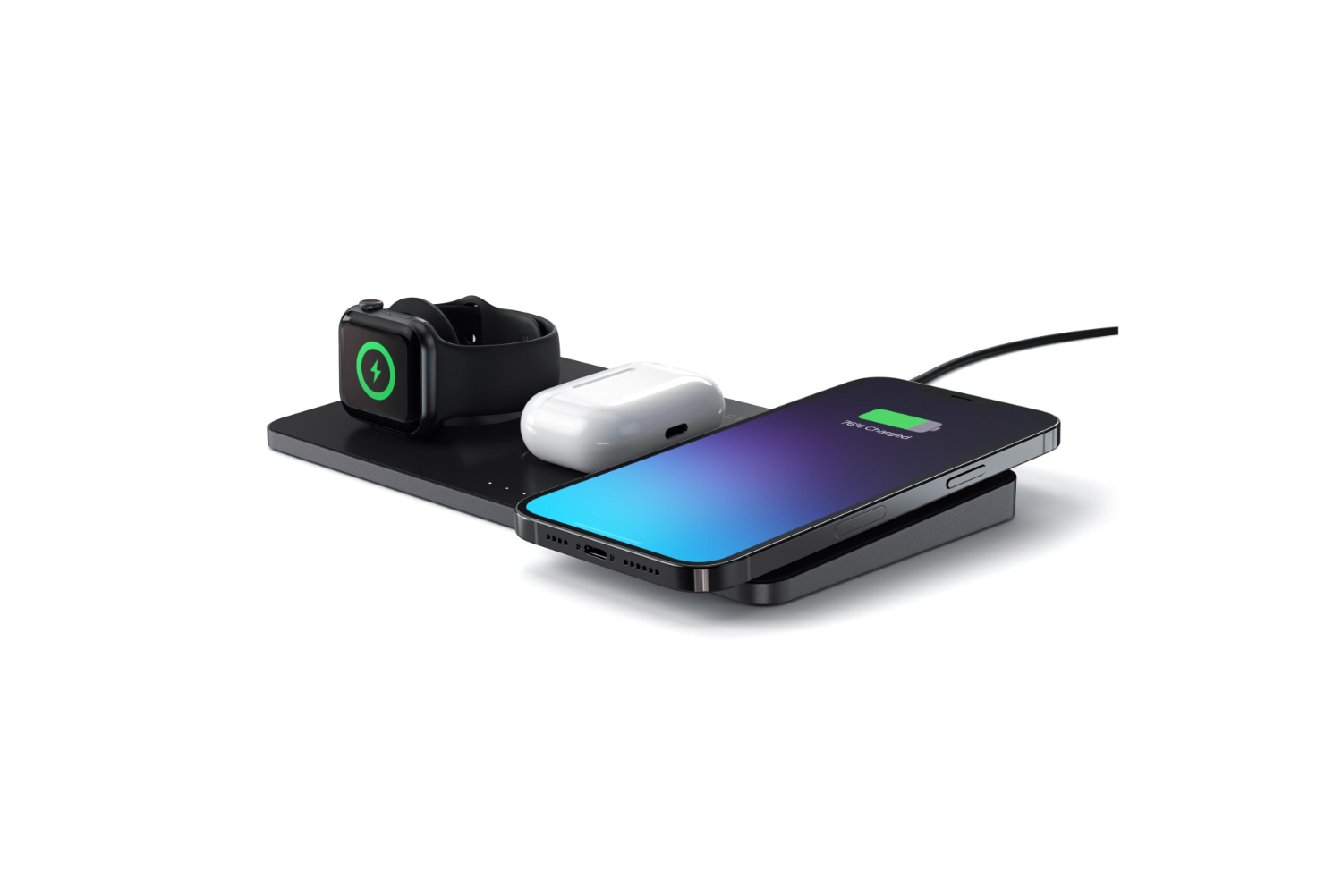 Simultaneously charge up to three devices – an Apple Watch Series (up to 2.5W), AirPods with wireless charging case (up to 5W), and a Qi-enabled iPhone (up to 7.5W) or smartphone – all from one sleek, modern station.