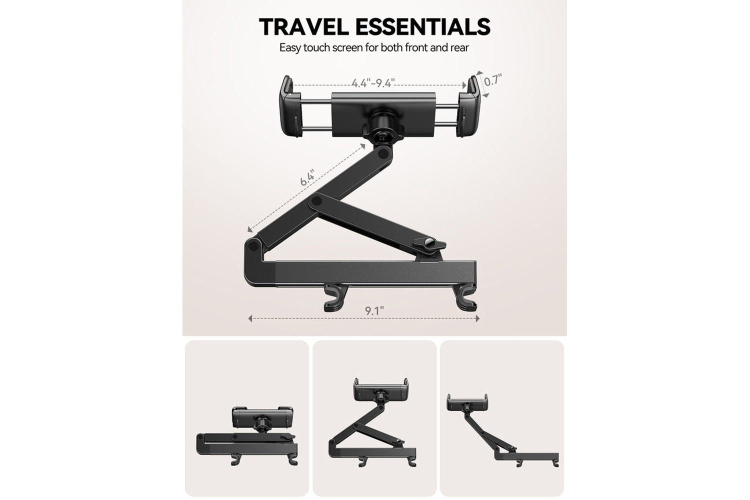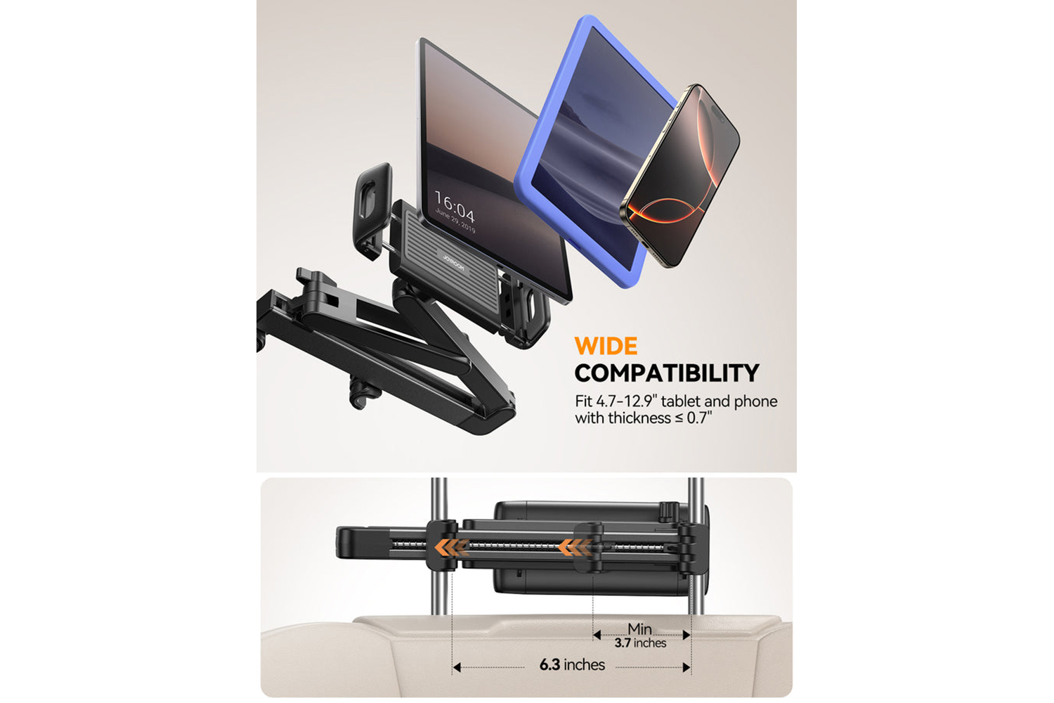 Broad compatibility with rear headrests spaced 70–158mm apart; supports devices ranging from 4.7 to 13 inches.