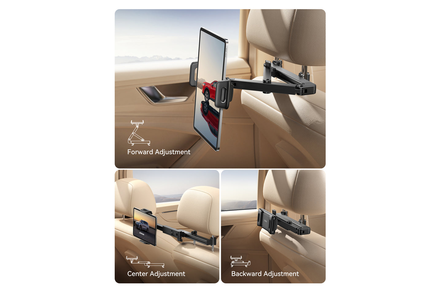 Multi-axis adjustable angles allow flexible positioning; accessible from both front and rear seats.