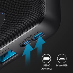 Recharge PowerCore using either the micro USB or USB-C ports. Micro USB cable included. USB-C cable not included. The USB-C port is input-only and cannot charge other devices.