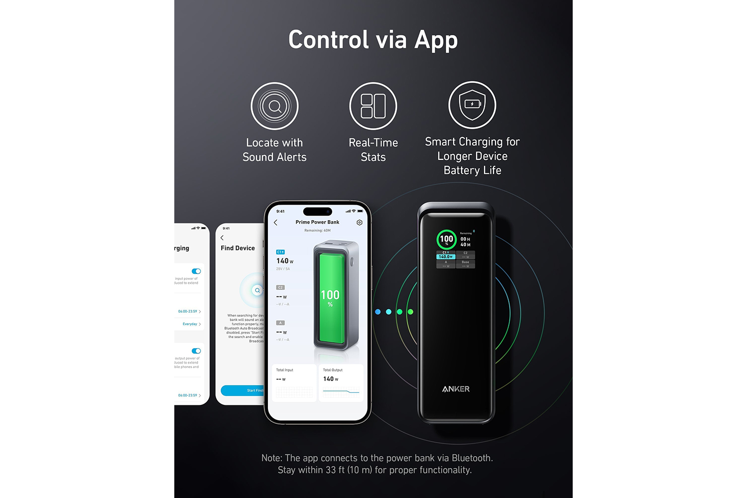 Use the Anker app to quickly locate your power bank with sound alerts, access real-time stats, and optimize device battery life with smart charging.