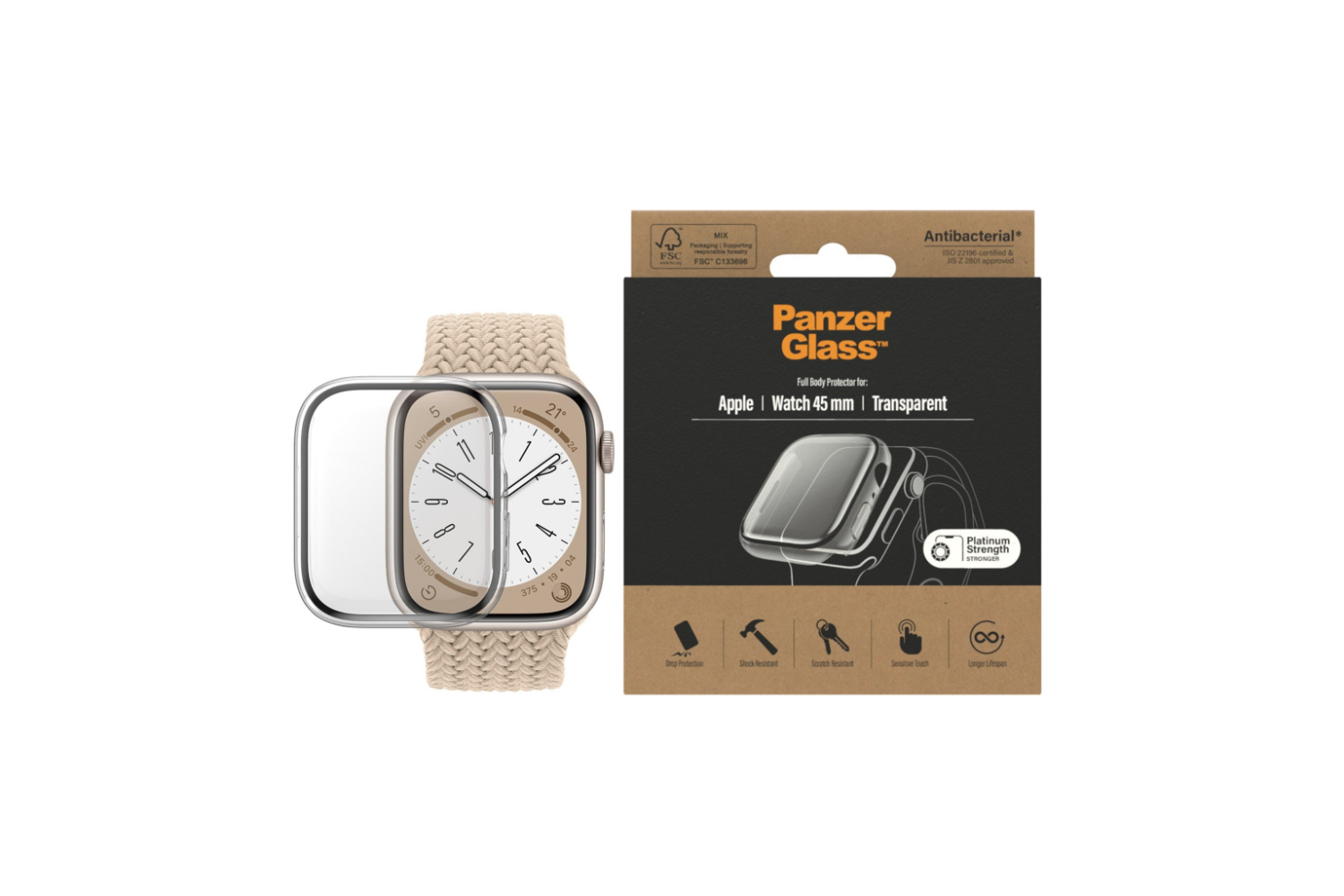 The full-body glass covers the entire front as well as the curved sides of your watch, while still providing easy access to all button controls. It comes in FSC-labelled packaging that can be recycled.