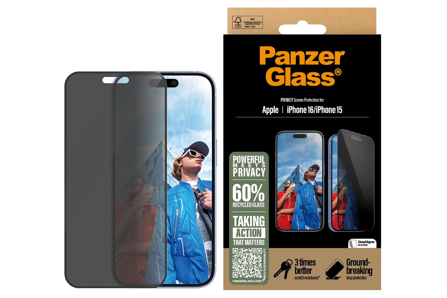 And the screen protection is outstanding! With high-level scratch resistance, this screen protector shields your phone screen from accidental bumps, crushing falls, and other hazards of everyday life. Or to put it in more sustainable terms: It prolongs the lifetime of your phone, postponing the need to produce new phones. This is one way of working toward a more sustainable future. Another is to use less packaging: In 2024, PanzerGlass reduced the amount of paper in PanzerGlass core product packaging design by an average of 66%*. And like all PanzerGlass products, it comes in a recyclable FSC certified box.