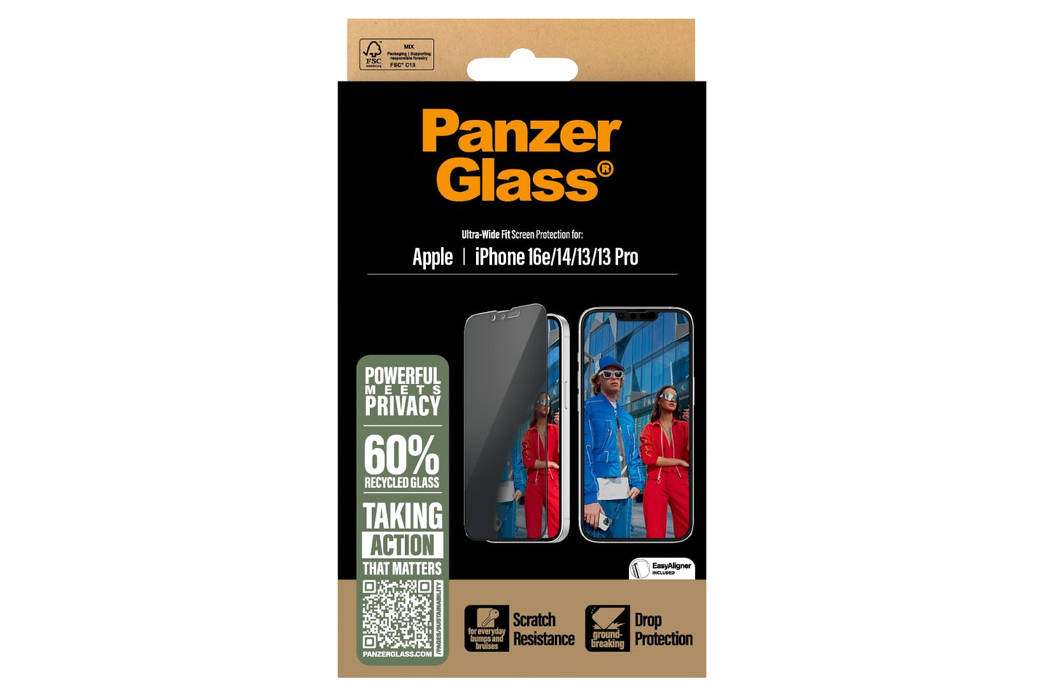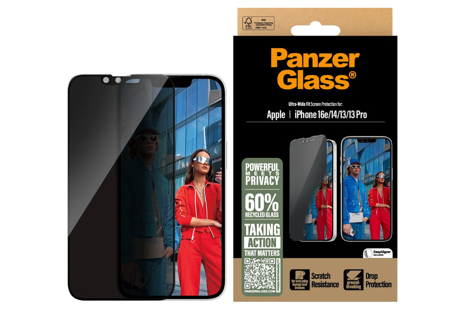 Powerful meets privacy! With this PanzerGlass privacy screen protector made of 60% recycled glass, your personal info is safe from the prying eyes of people sitting next to you on the train, in the coffee shop, or at the office. The specially designed privacy filter renders the content of your screen virtually invisible to everyone except you. It even has a smudge-free coating that reduces traces of fingerprints and grease to give you a clear – but still private – view of your screen.