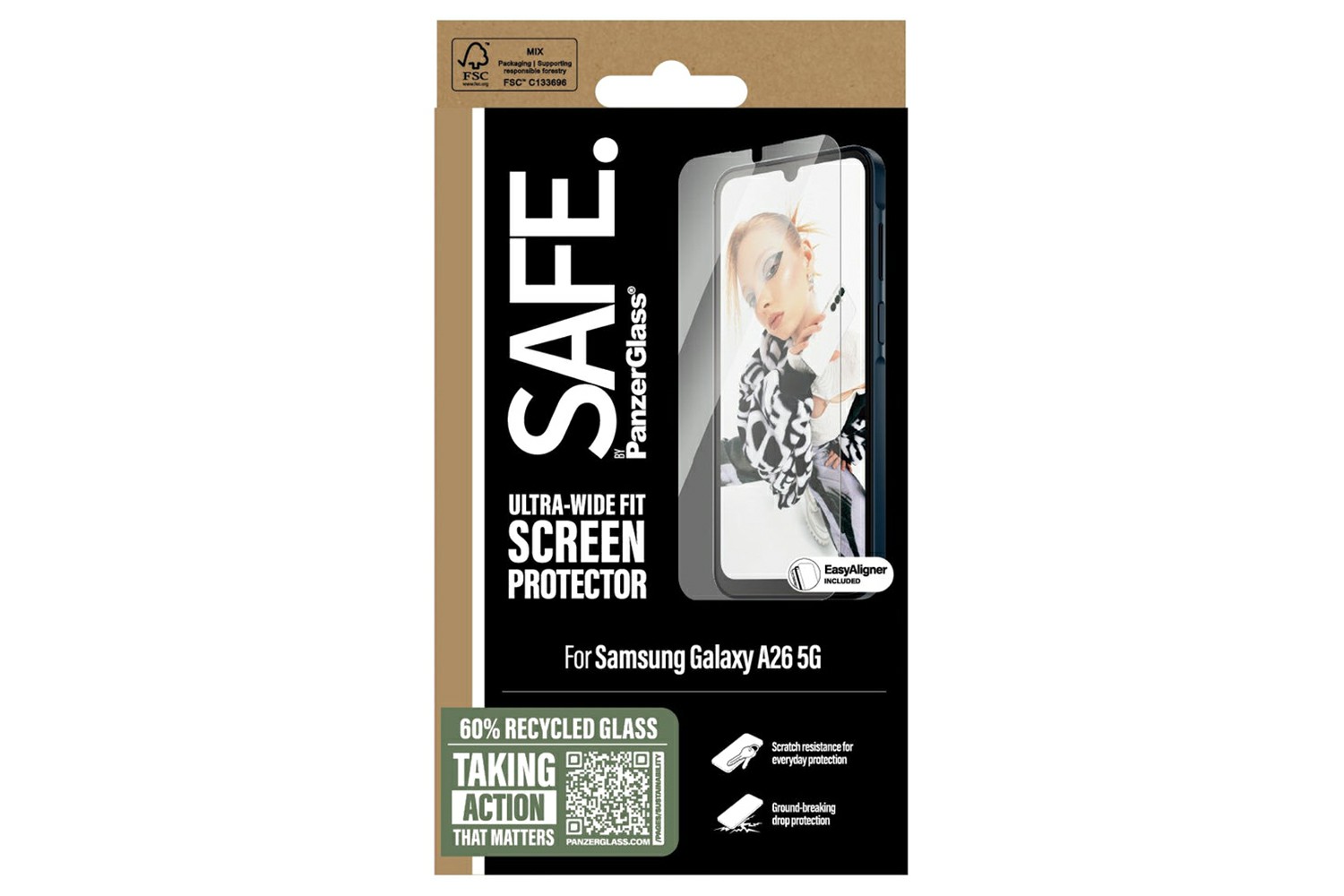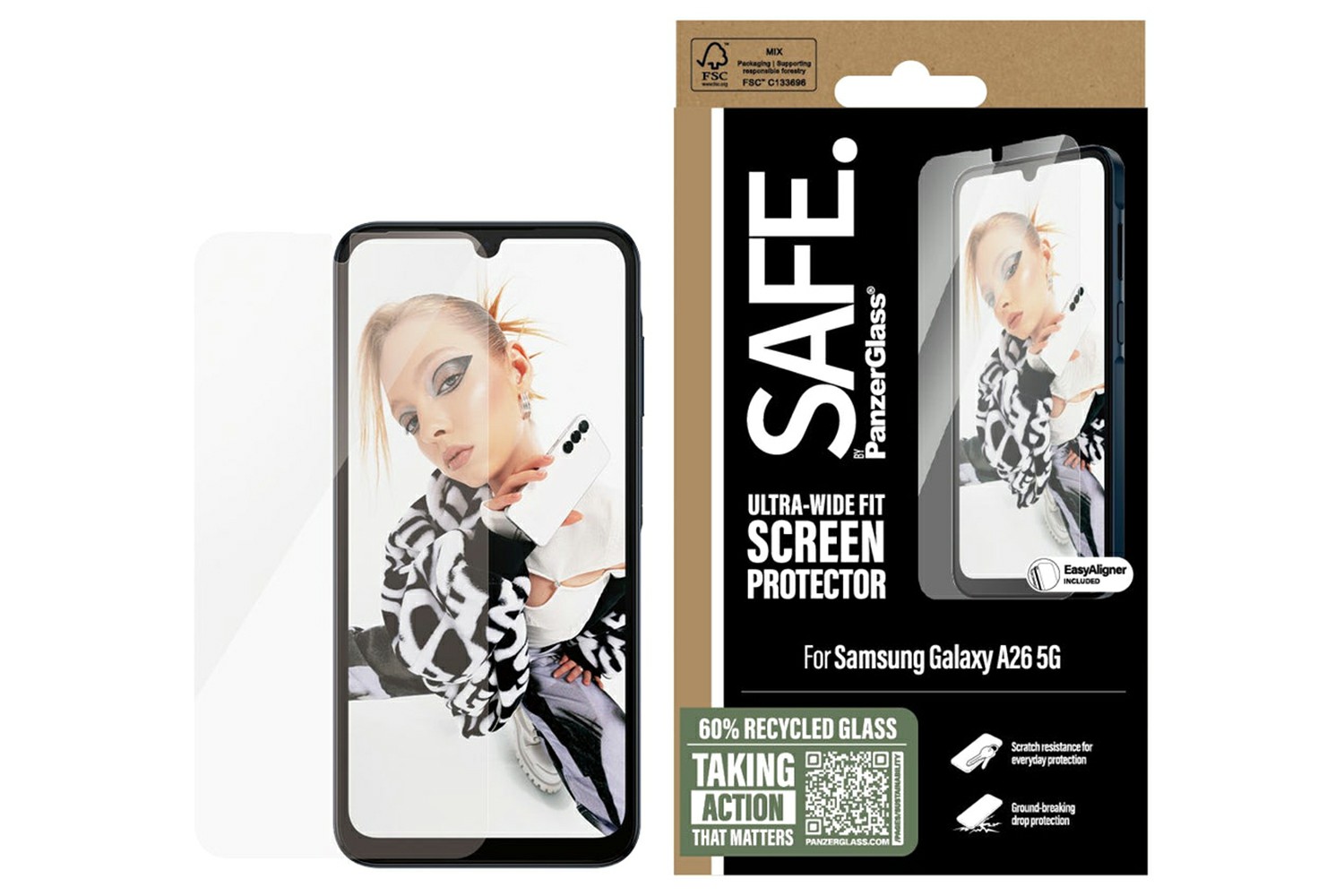 SAFE. is for real. SAFE. is for you. SAFE. is for dance floor mishaps, selfies gone wrong and your everyday fumbling, dropping and screen cracking. This SAFE. by PanzerGlass screen protector made of 60% recycled material acts as a discrete airbag, protecting your phone by absorbing impacts and providing high-level scratch resistance without compromising the functionality and look of your device. It even has a smudge-free coating that reduces traces of fingerprints and grease.