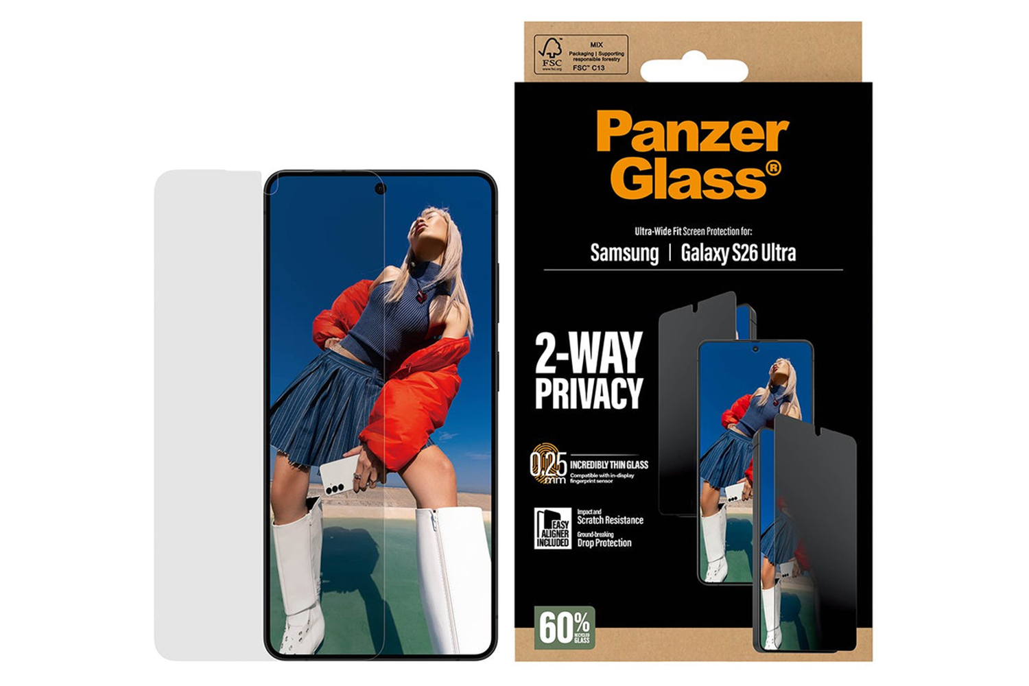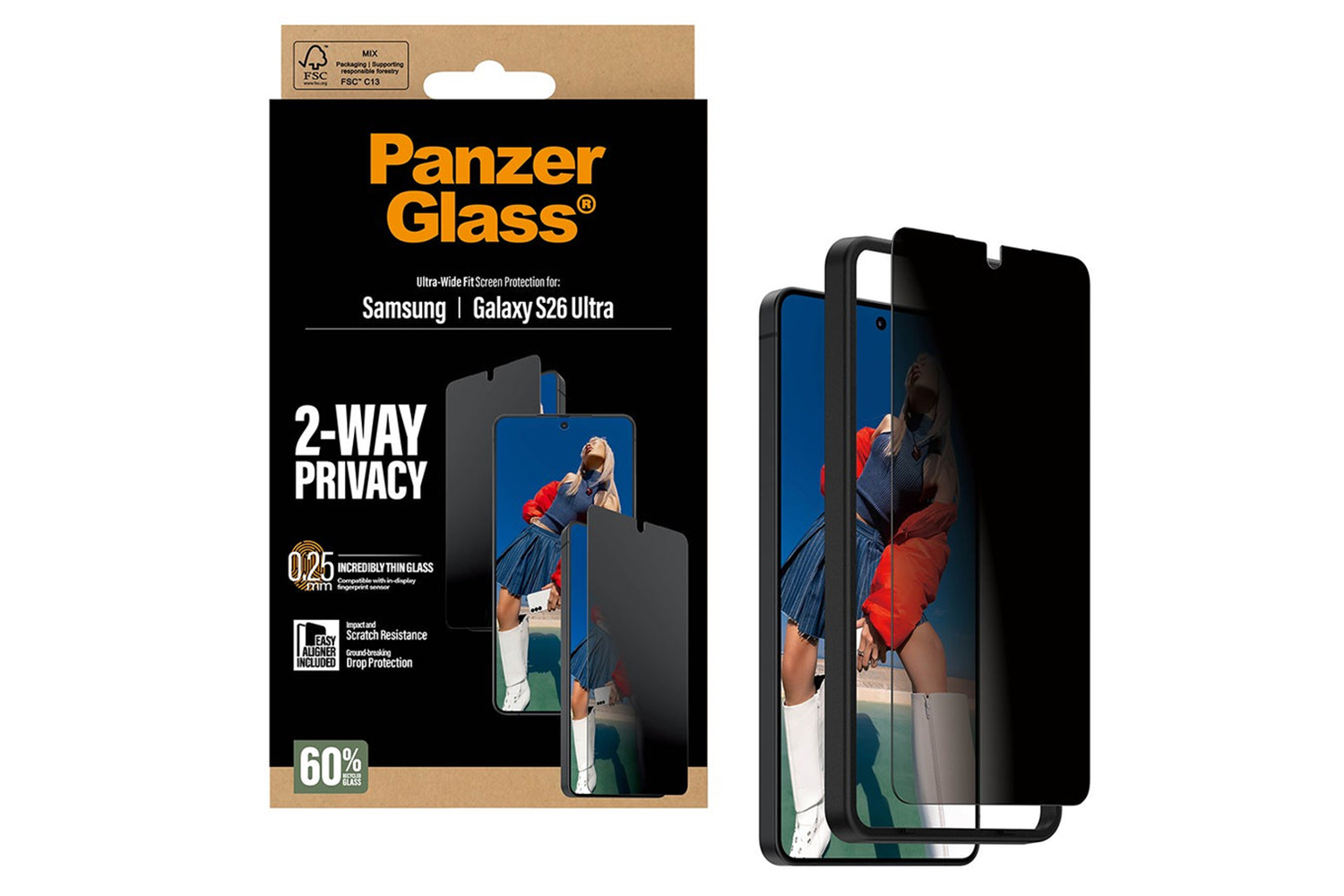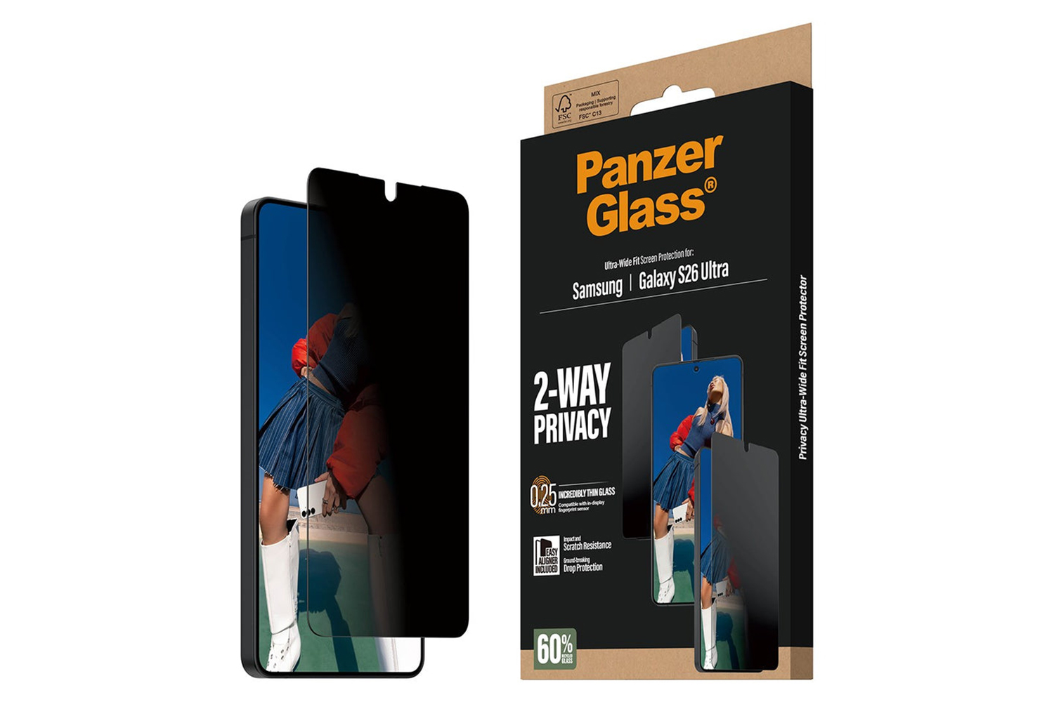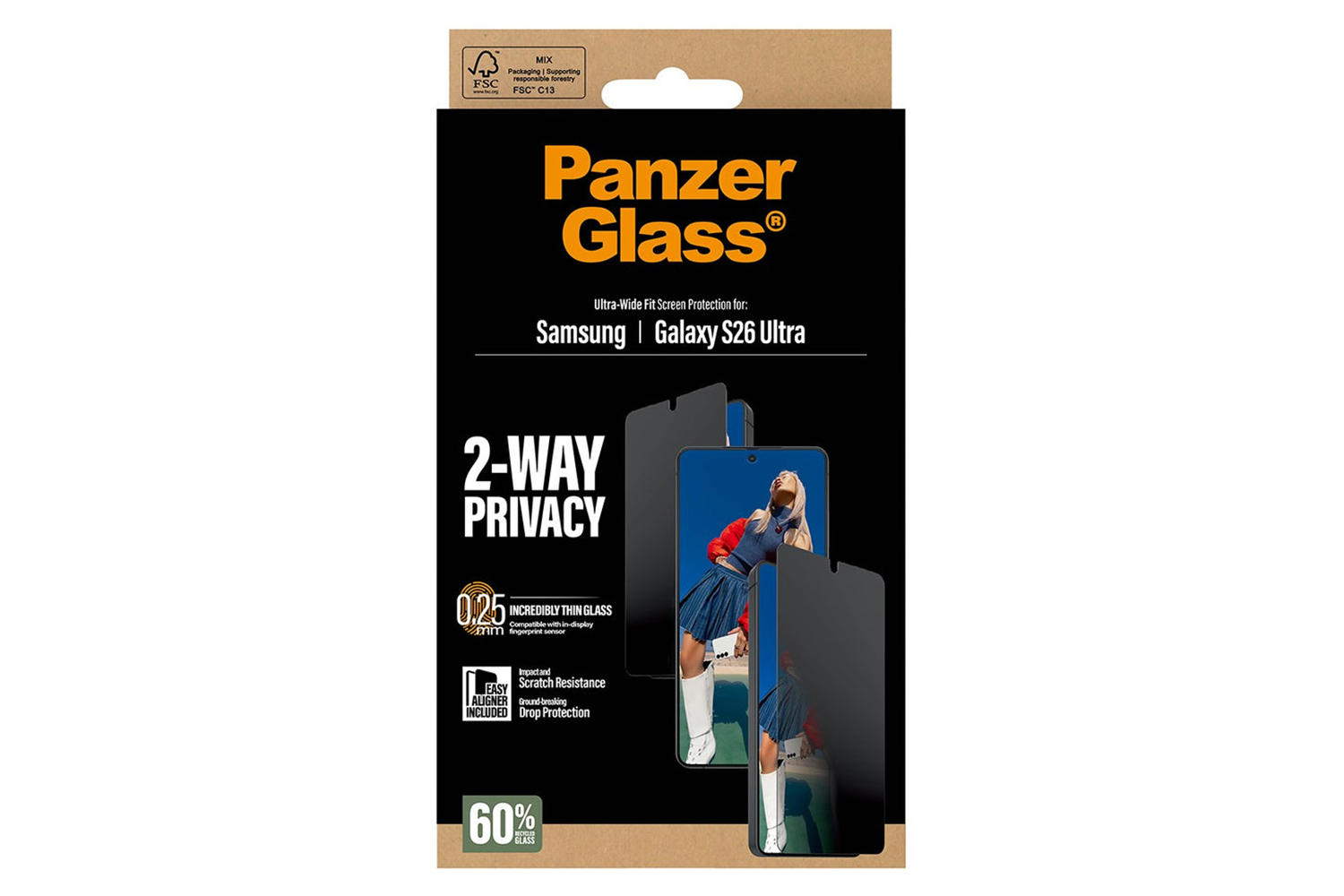Powerful meets privacy! With this PanzerGlass privacy screen protector made of 60% recycled glass, your personal info is safe from the prying eyes of people sitting next to you on the train, in the coffee shop, or at the office. The specially designed privacy filter renders the content of your screen virtually invisible to everyone except you. It even has a smudge-free coating that reduces traces of fingerprints and grease to give you a clear – but still private – view of your screen.